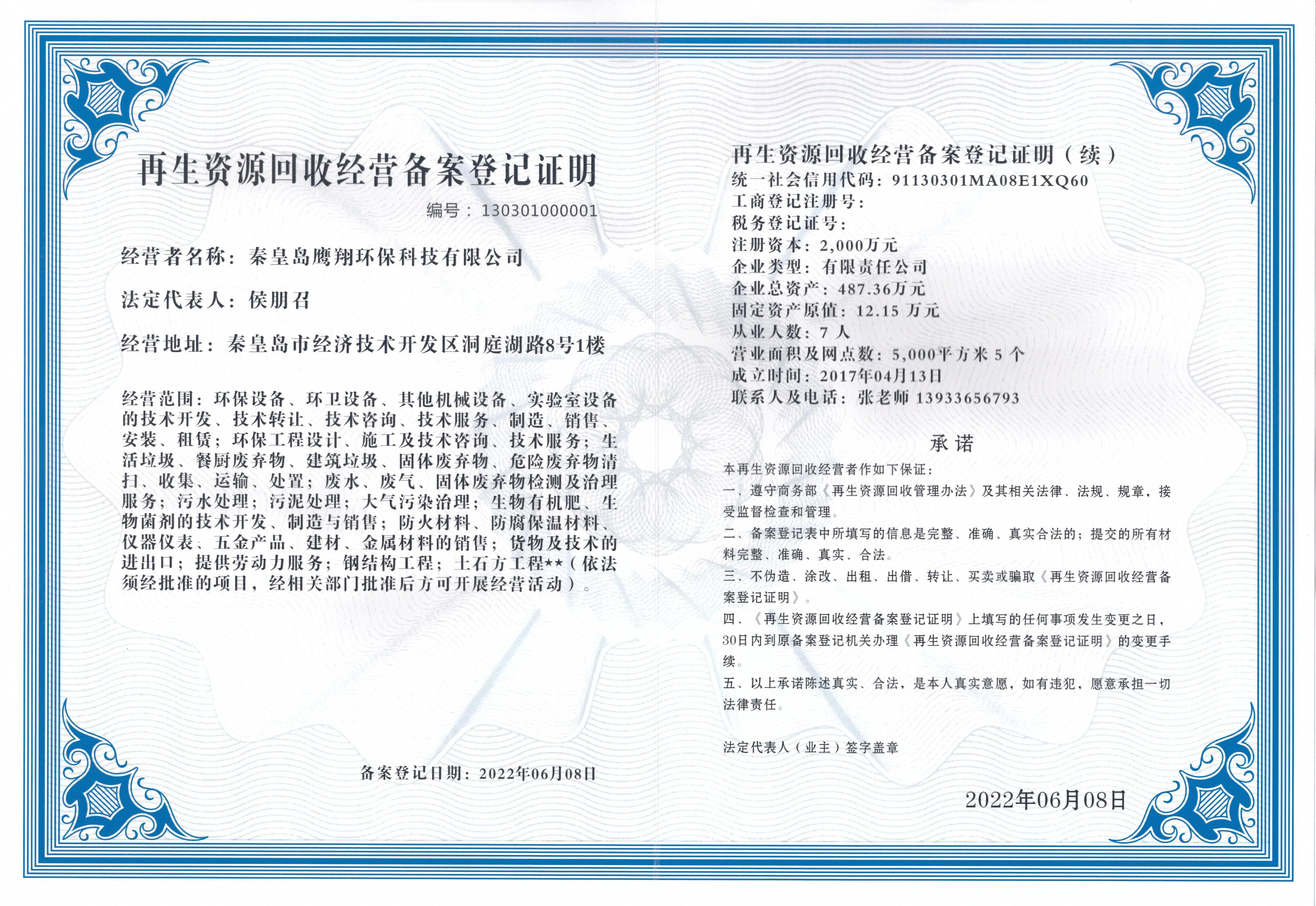 秦皇岛鹰翔环保科技有限公司是集研发制造,方案设计,分类运营,销售安装四位一体的高新技术企业。该公司与华北地质勘查局第四地质大队(国企)强强联合,打造了鹰翔品牌,专业研发生产垃圾处理设备,其产品被认定为科技新产品,还纳入了河北省工业和信息化厅重点领域首台(套)重大技术装备产品名录,同时公司也是中华人民共和国商务部“再生资源回收经营备案企业”。