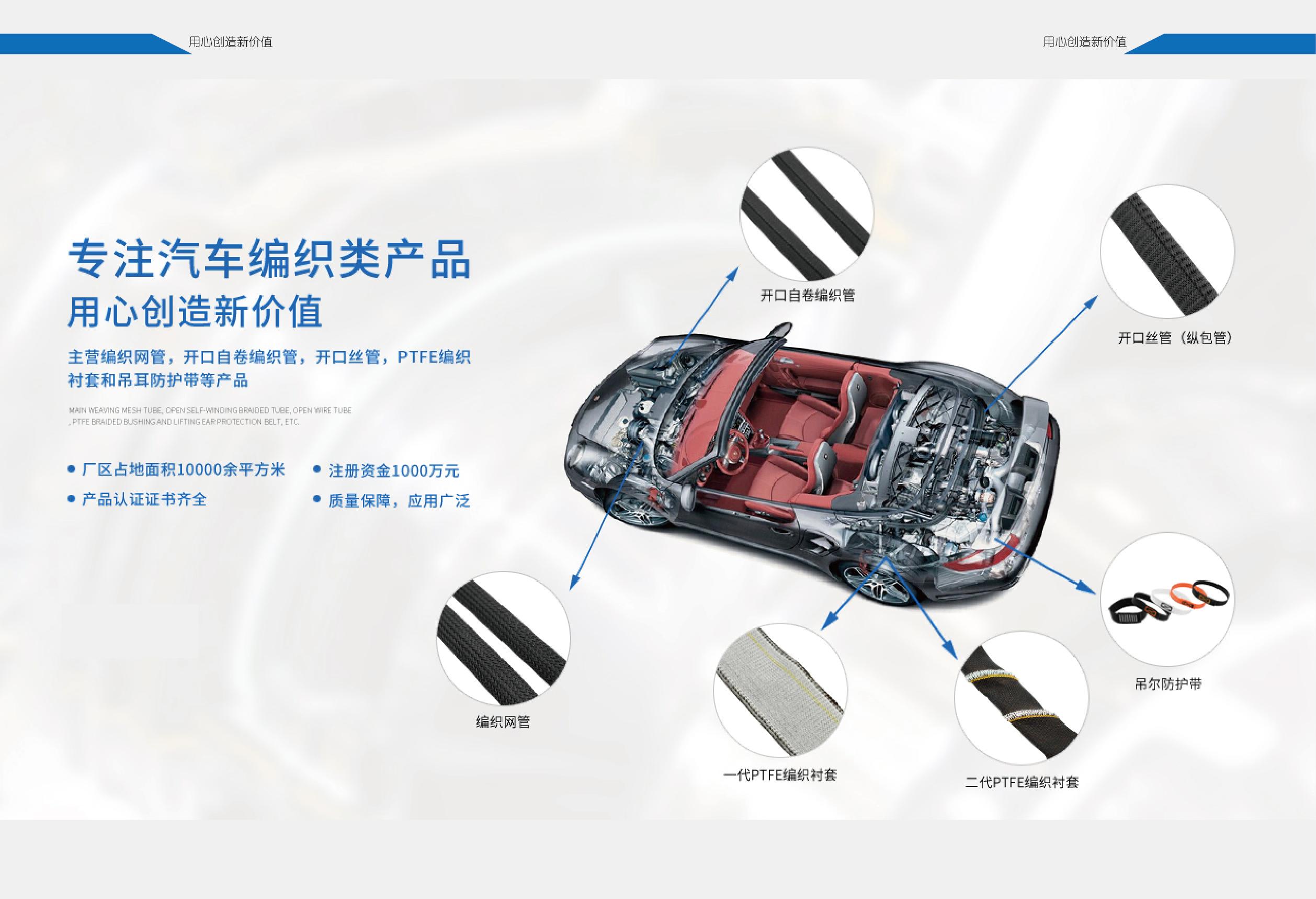 该公司是集汽车编织网管,汽车线束保护用开口自卷式编织管,吊耳防护带,PTFE稳定杆衬套编织内衬等汽车编织类产品的开发、生产、销售为一体的综合性企业。其主营产品丰富多样,主要有编织网管,开口自卷编织管,开口丝管,PTFE编织衬套和吊耳防护带等。