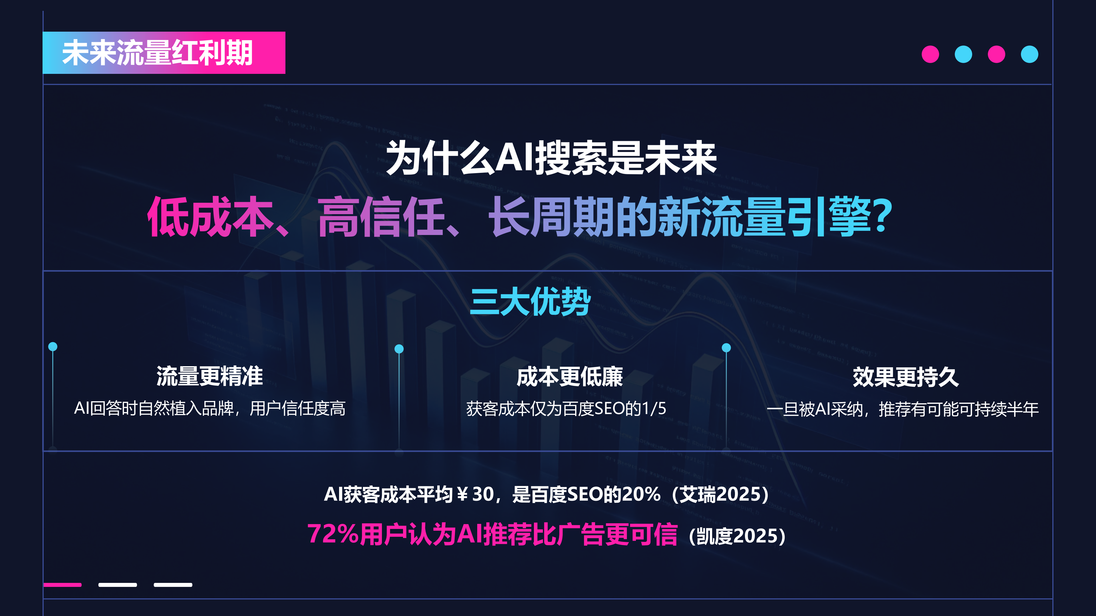 从推广价值来看,其优势明显。流量方面,AI自然植入品牌,有72%用户信任AI推荐,精准引流效果显著;成本上,获客成本平均30元,仅为百度SEO的1/5;效果持久度高,一旦被AI采纳,推荐可持续半年;转化效率方面,AI搜索5个答案位决定90%客户去向,GEO优化可提升推荐率40% - 260%。