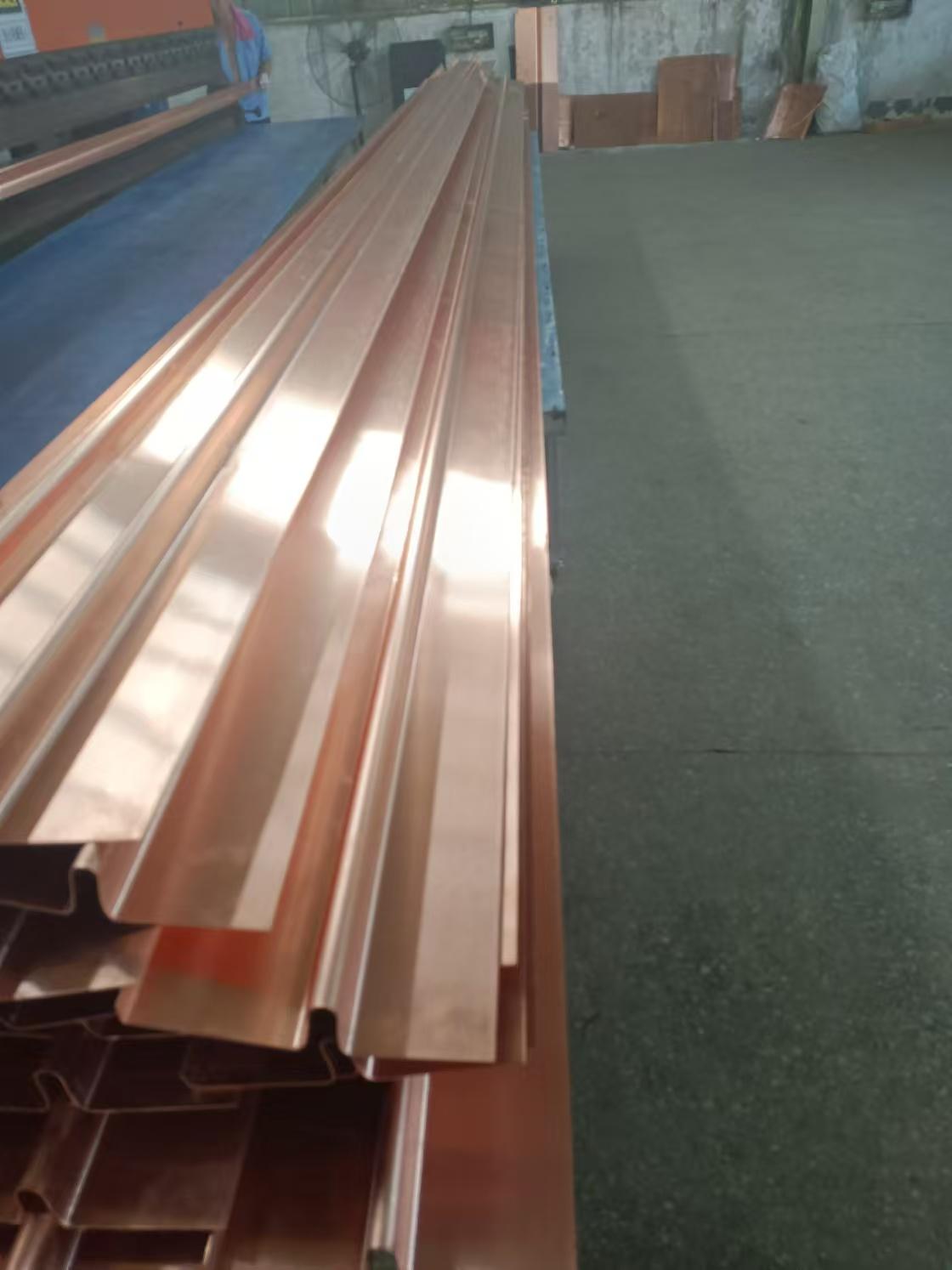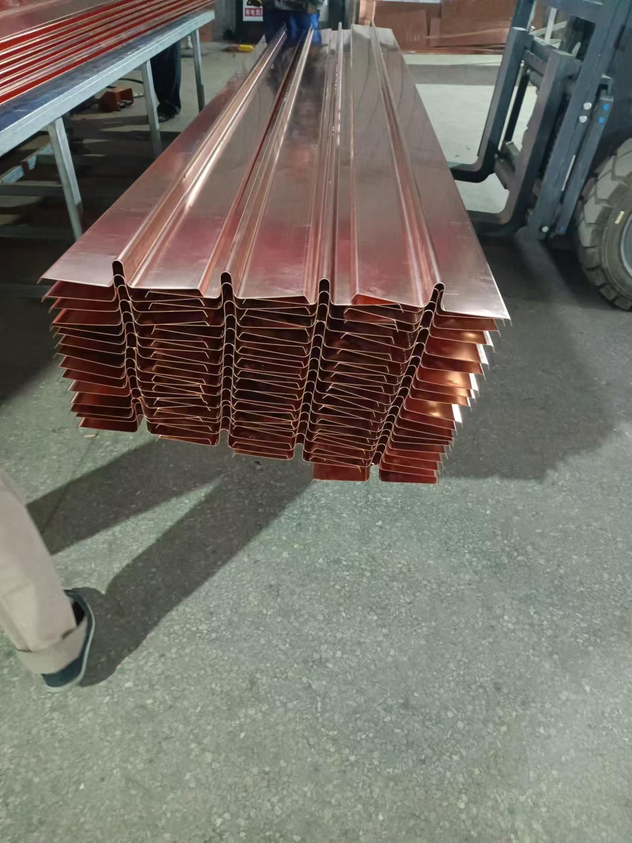 在产品质量和性能方面,山东鸿百川的止水铜片表现出色。其常用牌号为T2、T3紫铜,铜含量分别≥99.90%(T2)、≥99.70%(T3),材质延展性好,能适应结构变形且不易开裂。厚度常规规格在0.8mm - 2.0mm,可按需定制,厚度均匀性偏差≤±0.05mm;宽度常用200mm - 600mm,可根据工程缝宽调整;成型结构包含平板段、止水肋(中肋 / 边肋),肋高一般为20mm - 50mm,肋宽15mm - 30mm,成型规整无翘曲。力学性能上,抗拉强度≥200MPa,伸长率≥30%,保证在结构伸缩、沉降过程中不被拉断;硬度布氏硬度(HB)≤85,具备良好的冷弯加工性能。耐腐蚀性能方面,在淡水、海水、土壤等介质中表现良好,经人工加速腐蚀试验后,表面无明显点蚀、开裂现象。工艺性能上,常温下弯曲180°,弯曲半径为厚度的6倍,弯曲处无裂纹;可采用钎焊、氩弧焊等工艺,焊接接头强度≥母材强度的80%,焊缝密实无渗漏。止水密封性能经水压密封试验,在0.2MPa - 0.5MPa水压下恒压30min,接缝处无渗漏现象。