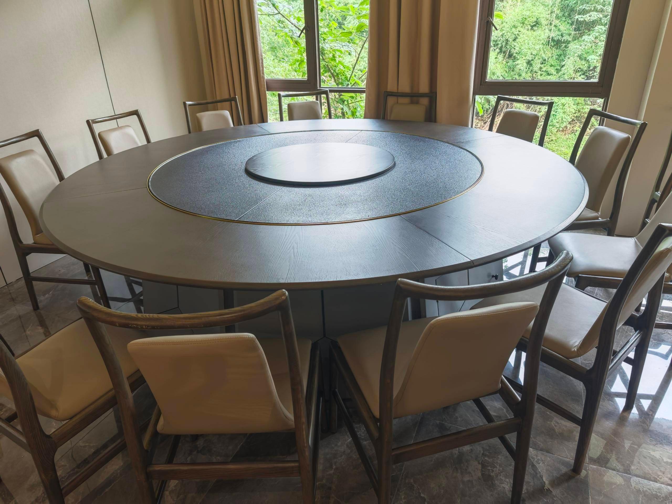 电动桌椅(中餐桌,火锅桌)具备智能电动转动,有恶意转动保护,集成无线充电、智能控温等智能功能。使用进口橡木等优质木材,实木雕花,特制耐热玻璃。电机有过载保护,五金件优质防锈,符合电气安全标准。