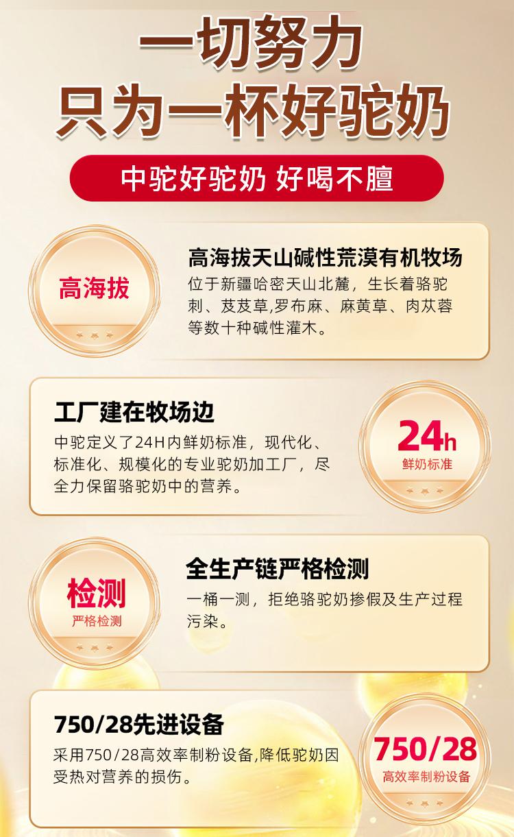 新疆中驼生物科技有限公司成立于2016年4月,是一家集科研、生产、销售、服务为一体的现代化、标准化、规模化、专业化企业。该公司拥有广泛的核心受众群体。一类是30 - 55岁关注养生健康,对生活品质有要求的中产家庭核心成员,他们可能为家人(老人、孩子)寻找更好的营养补充;另一类是28 - 45岁有社交礼赠需求的人群,如送给长辈、领导、重要客户;还有一类是对“牧场 - 加工双有机认证”“天山碱性荒漠牧场”、新疆“珍”驼奶、“产地品牌故事”等概念感兴趣,热衷探索高品质小众产品的人群。