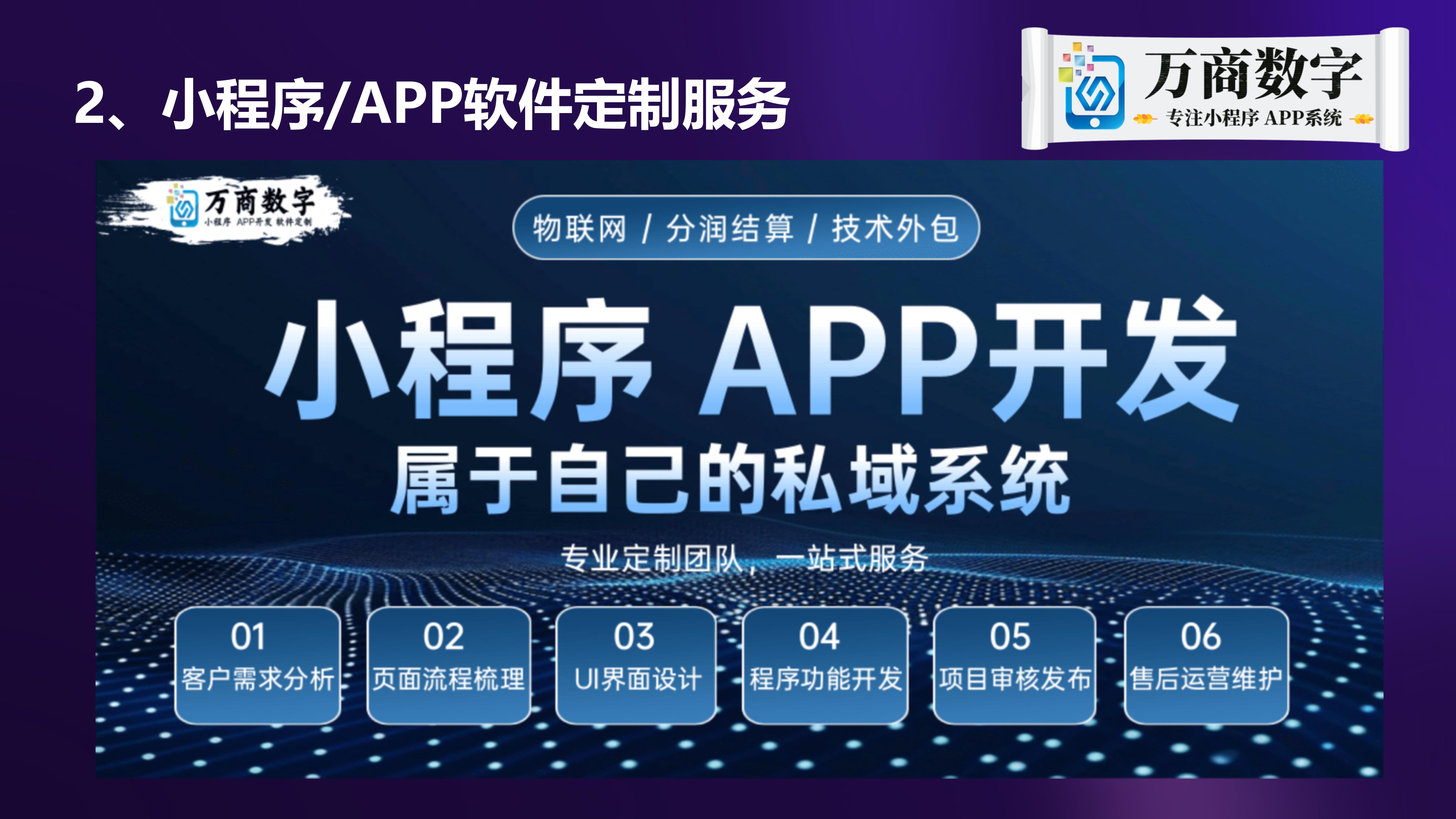 1. 自研“万商小程序”系统:面向多行业场景的标准化的模块小程序产品,支持企业线上营销,拥有电商交易、内容展示、会员管理等众多基础功能模块。