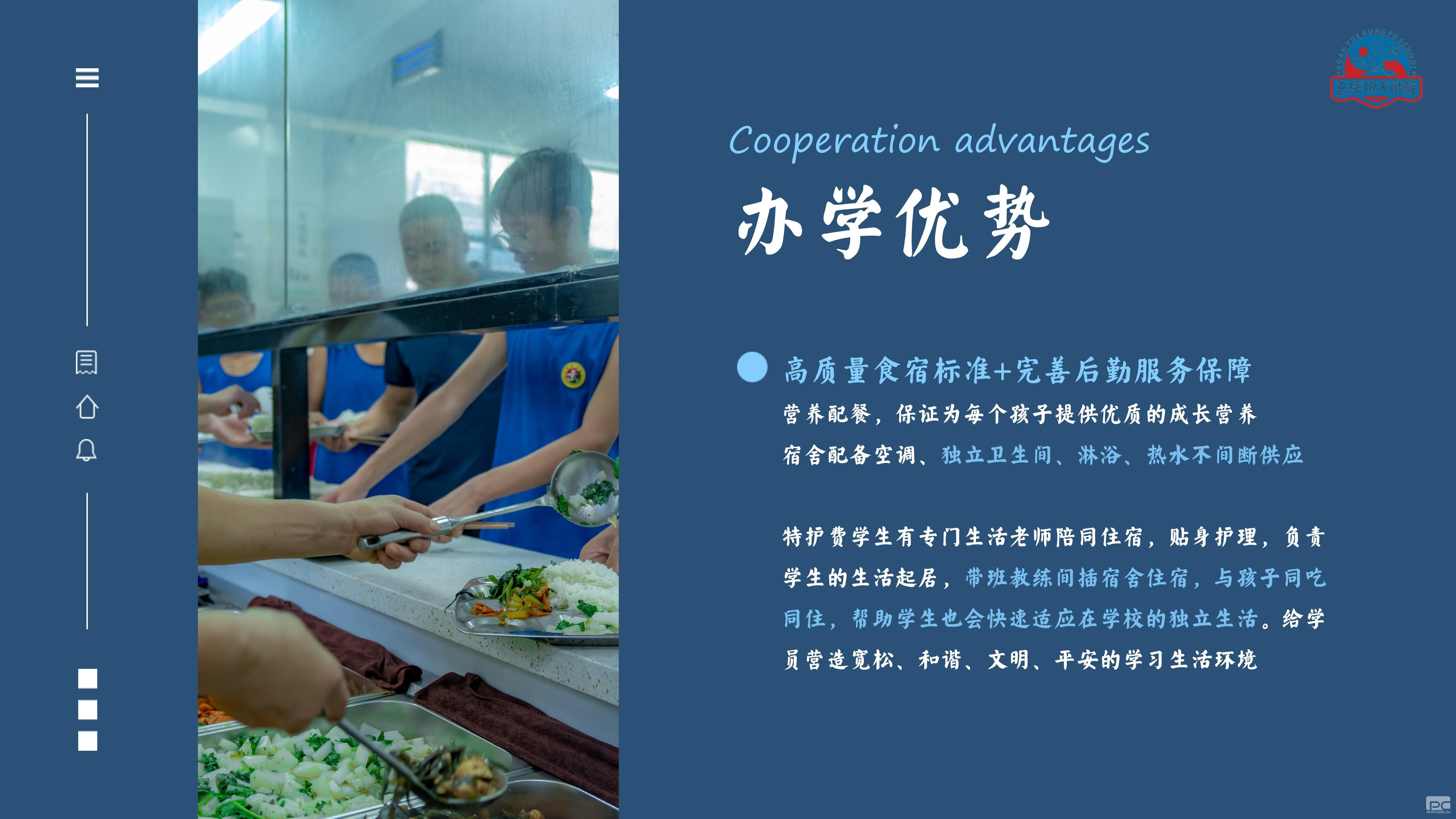 在食宿方面,学校提供高质量的食宿和完善的后勤服务保障。营养配餐6菜一汤保证每个孩子的成长营养,宿舍配备空调、独立卫生间、淋浴、热水24H供应。特护费学生有专门生活老师陪同住宿,贴身护理,负责学生的生活起居,带班教练同宿舍住宿,与孩子同吃同住,帮助学生快速适应在学校的独立生活,给学员营造宽松、和谐、文明、平安的学习生活环境。