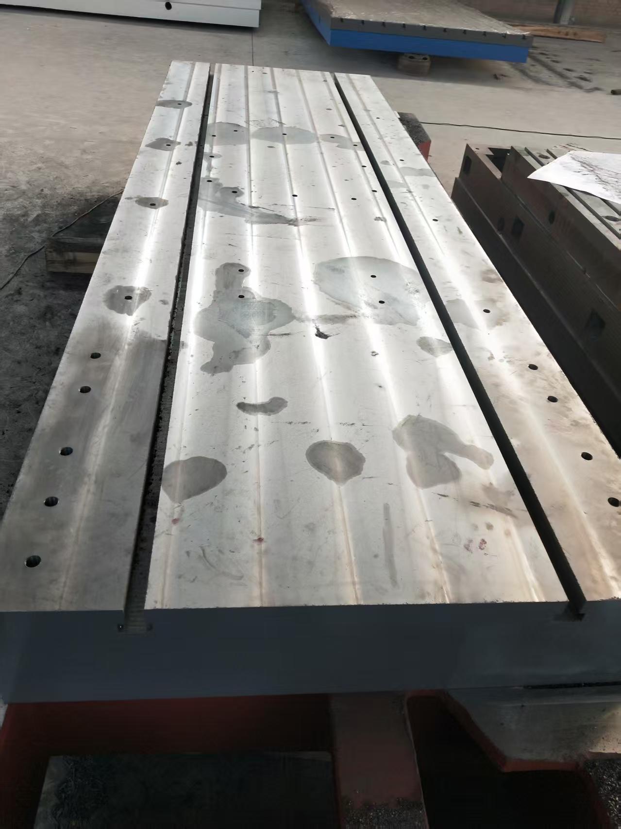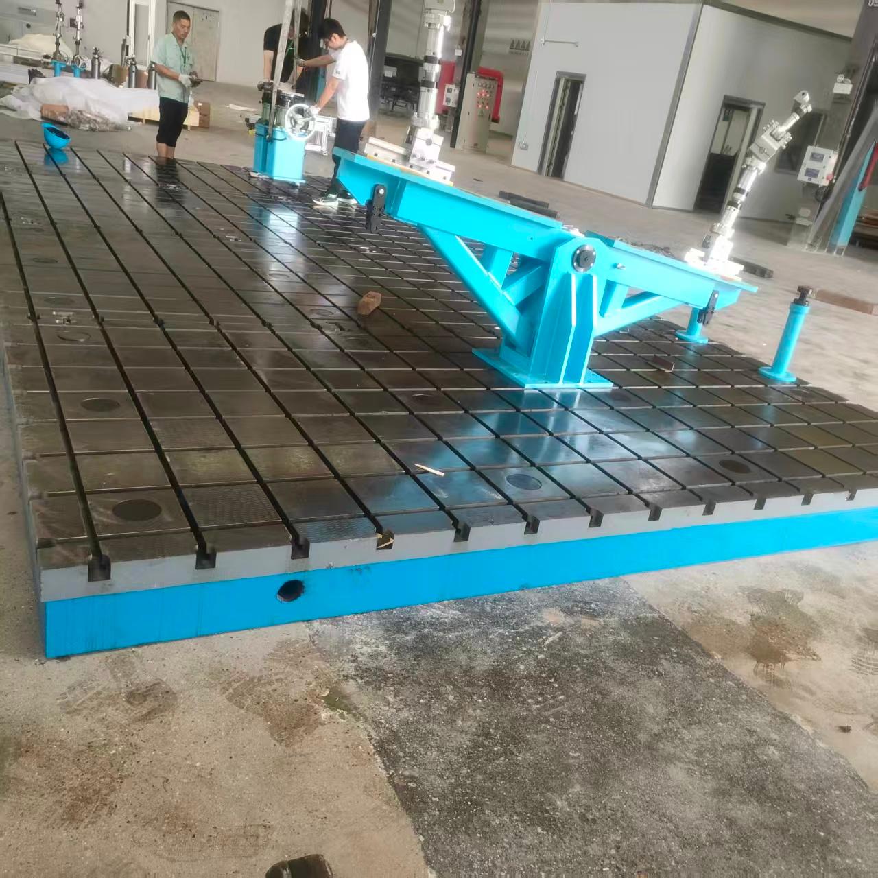 以焊接平台为例,整体为筋板式或箱体式结构,底部设井字形 / 米字形加强筋,刚性强、抗变形;工作面平整,可加工 T 型槽,便于工件固定;经人工时效或自然时效处理,彻底消除内应力,高温焊接工况下稳定性好。广泛应用于机械制造、钢结构加工、汽车零部件、工程机械等领域,用于工件焊接、铆焊、装配、定位及基准检测,适配单件小批量、多工位组合等各类焊接作业。