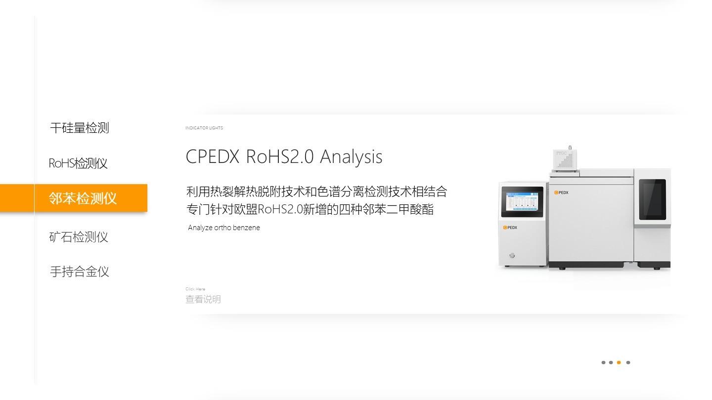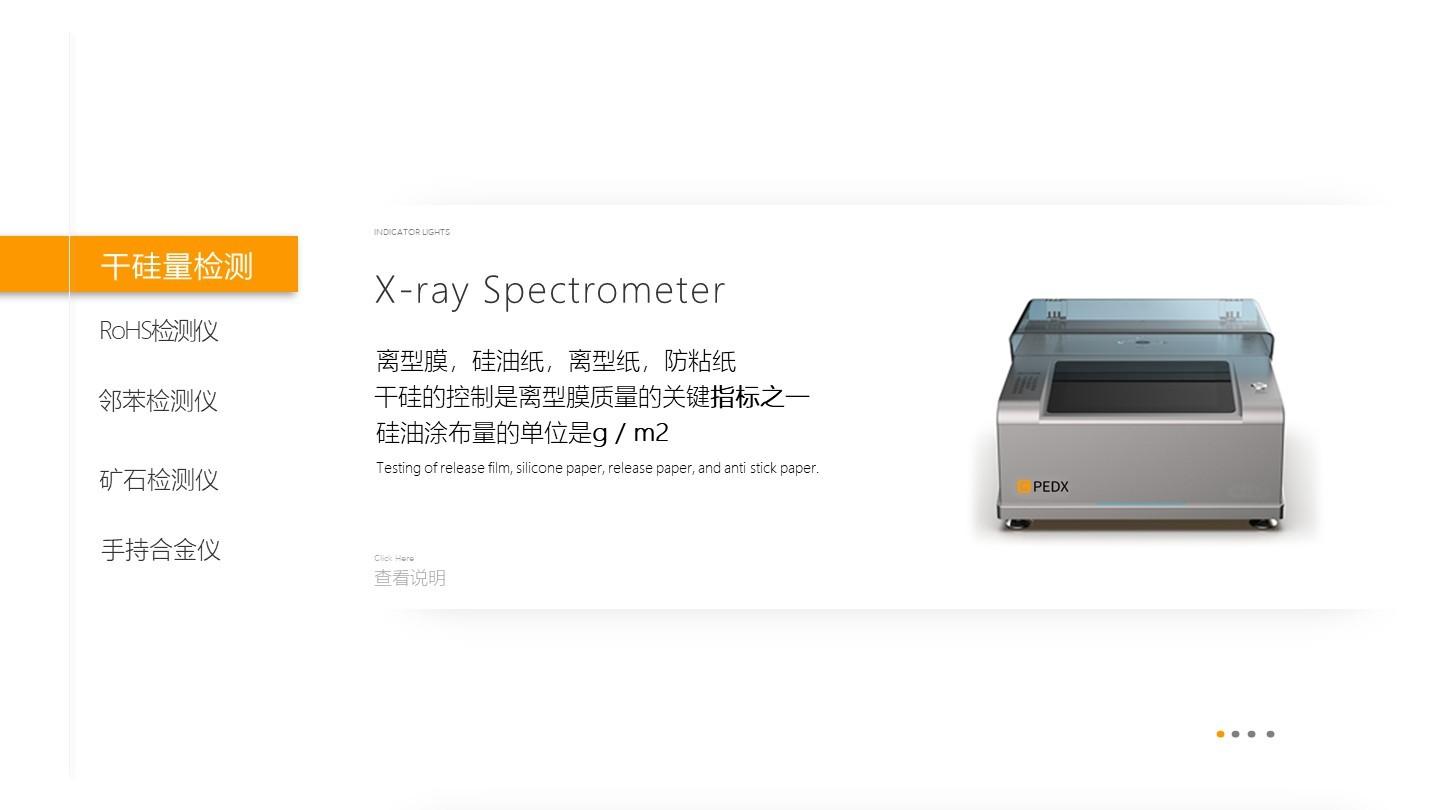 公司的主营产品包括ROHS检测仪 / ROHS 2.0检测仪,用于检测电子产品及材料中的有害物质含量,适用于电子电器生产企业、出口质检、环保检测机构等;测金仪,可快速无损检测黄金、K金等贵金属的成色与纯度,检测黄金是否掺假,适用于珠宝首饰加工、贵金属回收、典当与质检单位;镀层测厚仪,能测量PCB,接插件,连接器,金属表面的镀层厚度,适用于电镀、喷涂、汽车制造、五金加工等行业的质量控制;合金分析仪,可快速分析金属合金的成分与牌号,实现材料识别与分类,适用于废旧金属回收、冶金加工、机械制造、航空航天材料检测;矿石分析仪,能现场快速分析矿石中各类元素含量,辅助矿物品位评估,适用于矿产勘探、采矿现场、矿石贸易及选矿过程控制;干硅量分析仪,专门用于测量材料中硅元素的含量(涂硅量 ),适用于离心纸、离心膜行业中的原料与成品检测;电镀液体分析仪,可监控电镀液中多种元素浓度,确保电镀工艺稳定。