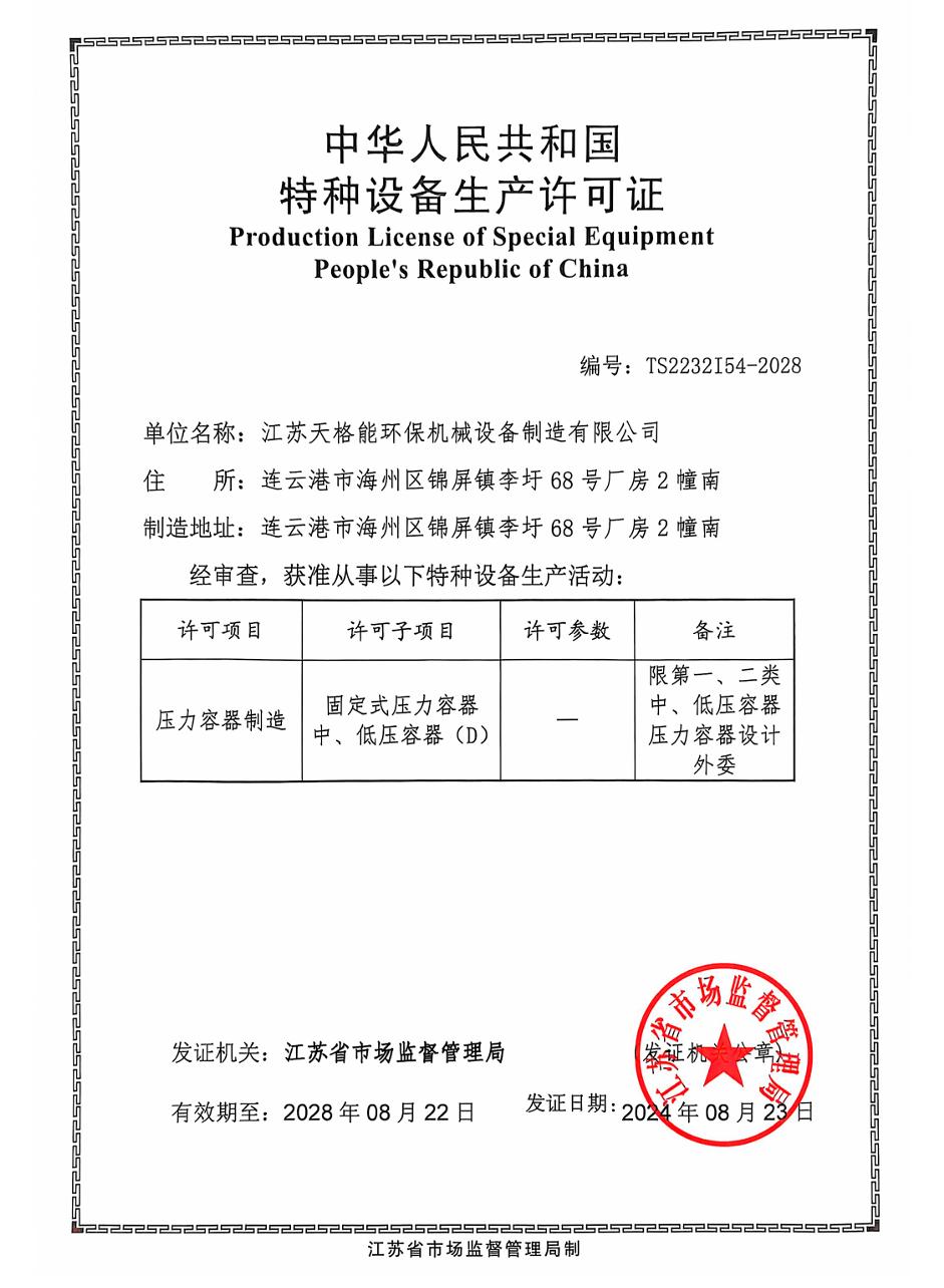 在****方面,江苏天格能环保机械设备制造有限公司荣获了高新技术企业证书,通过了质量管理体系认证(GB/T19001 - 2016/IS09001:2015),拥有压力容器制造 - 特种设备生产许可证,还获得了除氧器加入装置系统 V1.0 证书等。此外,公司还有多项实用新型专利,如一种消音器结构、一种微穿孔消声器、一种全自动反冲洗石英砂过滤器、一种螺旋煤粉取样器、一种除氧器水封装置、一种带压缩空气吹扫功能的风机消声器等,这些都体现了公司在技术研发方面的实力。