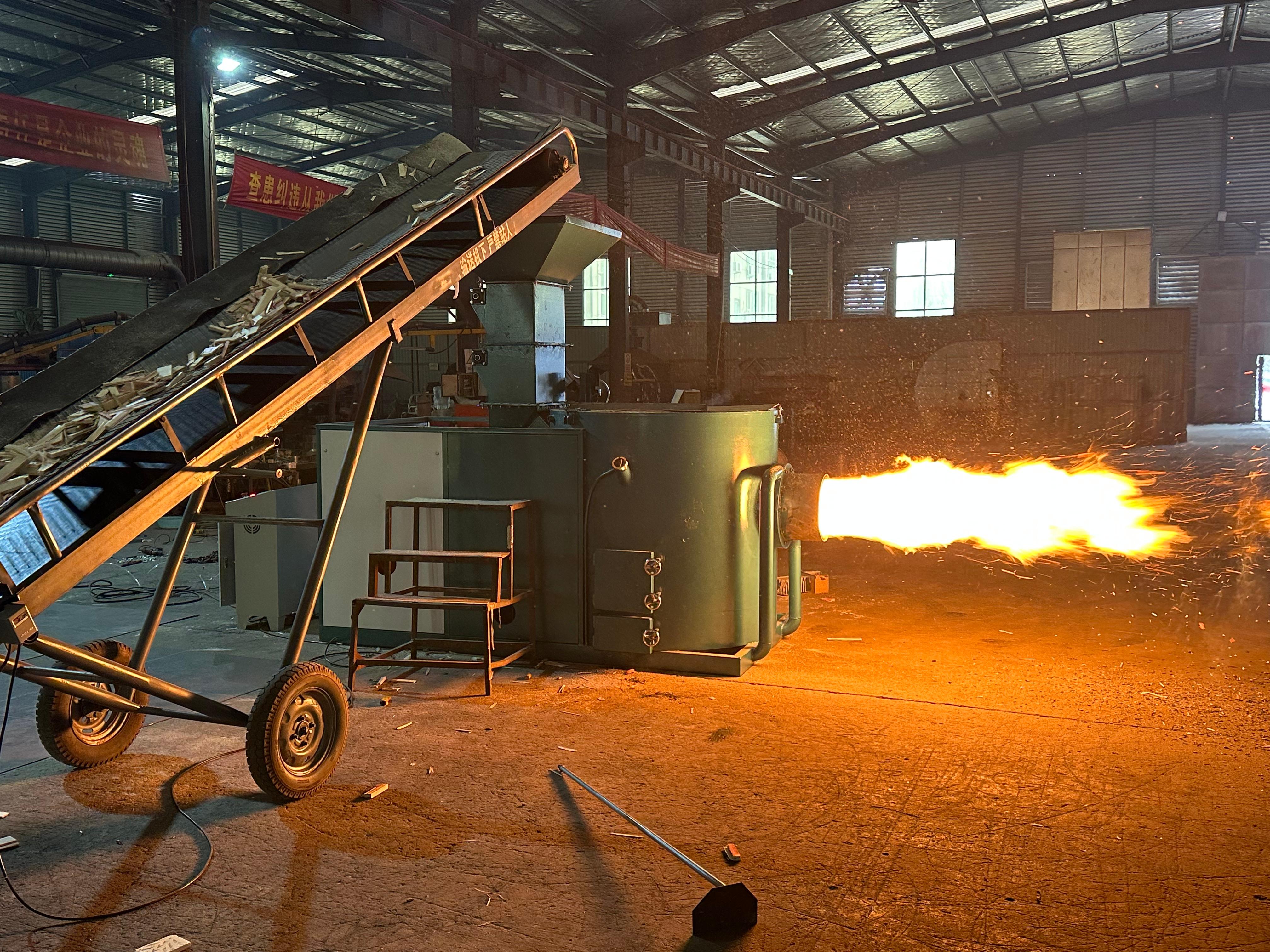 其主营产品生物质颗粒燃烧机采用半气化燃烧方式,大大提高了燃料的利用率,燃烧特别充分。同时,由于半气化燃烧时燃料中的挥发分得以充分燃烧,降低了排放尾气中的有害物质及一氧化碳。工作时,生物质从上料机构均匀进入高温裂解燃烧室,着火后,燃料中的挥发分快速析出,火焰向内燃烧,在气(固)相燃烧室内迅速形成高温区。高温裂解燃烧室内的燃料在高温缺氧条件下不断分解为可燃气体,送往气相燃烧室内进行气相燃烧;90%以上挥发份被裂解为炙热燃料,由输送系统输送到固相燃烧室内进行固相燃烧,完全燃烬后的灰渣排往渣池或灰坑。在输送过程中,小颗粒燃料和未燃尽的微粒在风动作用下于气(固)相燃烧室内悬浮燃烧;为完全燃烧,从多个配氧处可按比例自动调配、补充所需量的氧气,为炉膛出口的燃烧助燃,完全燃烧后的高温烟气通往锅炉受热面被吸收后,再经除尘后排往大气。
