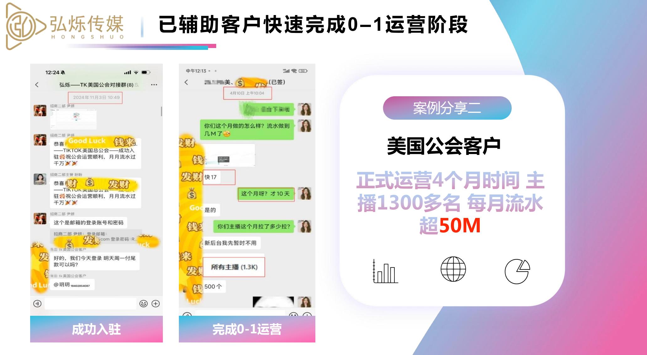 从市场规模与口碑来看,自成立以来,弘烁传媒业务规模逐年稳步增长,合作客户累计近10万,接待各类咨询客户超55万,成功案例超10万 +。服务网络覆盖广泛,国内全面覆盖全国各省市,国际市场延伸至全球27个地区,与TikTok、Bigo等全球主流直播平台建立长期稳定的战略合作伙伴关系。公司注重口碑建设,凭借规范的管理、高效的响应和优质的服务,积累了大量正面口碑,客户复购率保持较高水平,多次参与行业相关交流活动,媒体曝光度较高,在行业内形成了良好的品牌影响力。