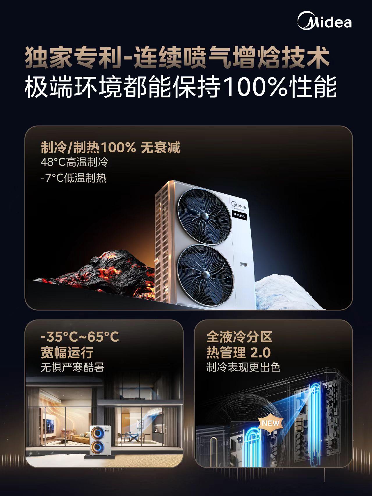 美的**者IV是专为大户型打造的家用中央空调,主打更舒适、更静音、更省电,攻克了行业 “低频不稳、高频衰减、送风不适” 三大痛点。其核心搭载三大**技术:国际**ACE低频稳态系统,支持10小时单开制冷无启停,温度波动控制在 ±0.3℃,消除忽冷忽热与启停噪音,APF 6.55超一级能效,省电48%;行业首创双出风内机,历时1221天研发,适配3种智能送风模式,实现14米远距送风,达温快3倍,客餐厅全覆盖且远近、头足温差均 < 1℃;**专利连续喷气增焓技术, -7℃低温、48℃高温下性能100%无衰减,搭配全液冷分区热管理2.0,可在 - 35℃~65℃宽温域稳定运行。