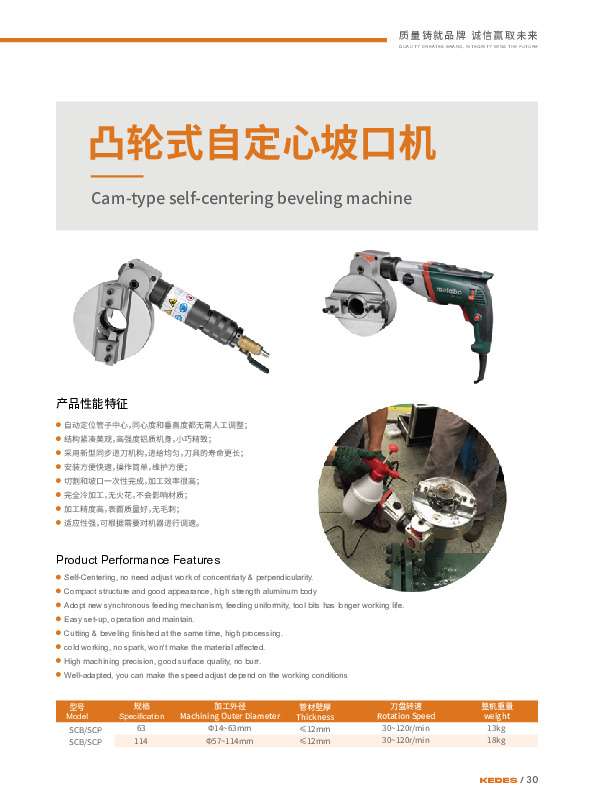 凯德盛的自动管道坡口机系列性能突出。其坡口机涵盖外钳式、卡盘式、内胀式、凸轮式等类型,采用冷加工工艺,无火花、不影响材料金相,避免热变形。坡口角度可在0°-45°(部分机型0°-90°)任意调节,加工表面光洁度Ra3.2,适配多种材质。