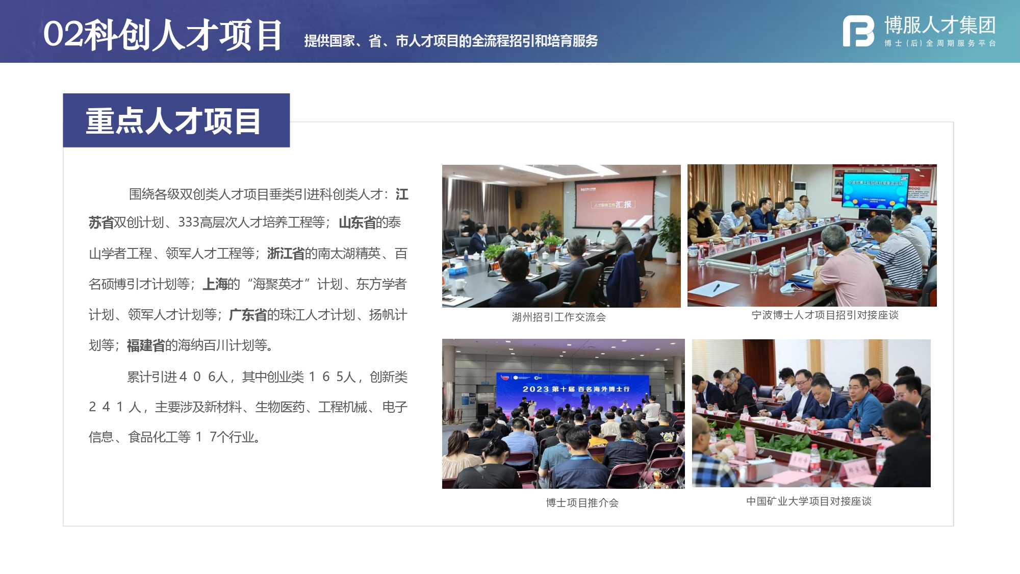 近年来,集团以数字化转型为驱动,以博士后特色服务为引领,以海外引才和城市引才为重点,打造博服人才集团核心竞争力和行业生态产业链。其专业的服务也得到了合作单位的高度认可,湖州市人力资源与社会保障局评价道:“贵公司在人力资源服务领域具备丰富的实践经验和专业团队,能够根据地方产业发展需求,精准对接优质博士、博士后及海外高层次人才资源,为我市(区)的人才工程实施提供了有力支撑。”