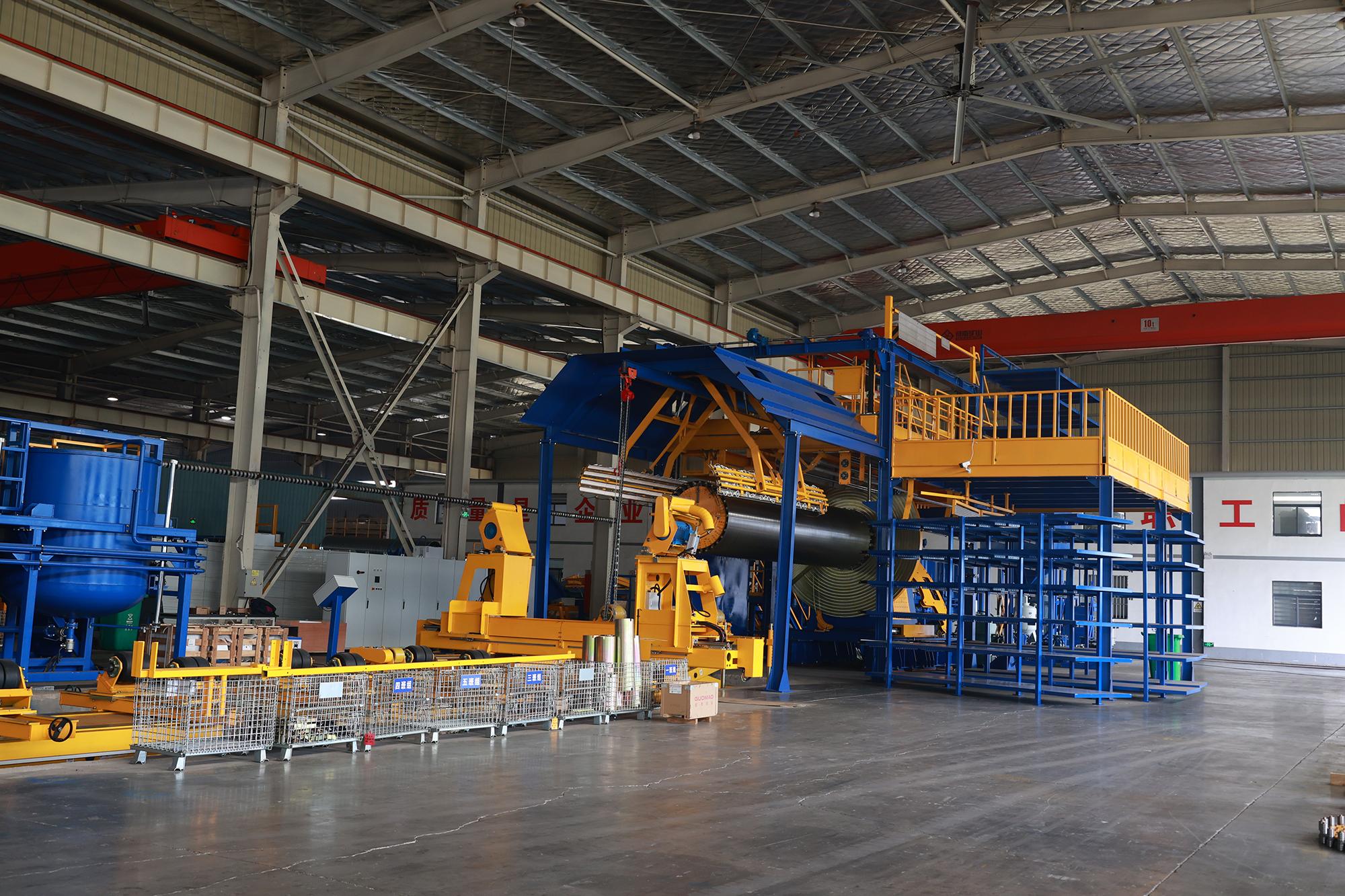 CFW系列缠绕机作为生产线的核心设备,功能强大。它集成了主轴传动装置、稳固的总体框架、精准的钢带推进装置等众多精密组件。这些组件紧密协作,确保了管道生产的高效率和高质量。从技术层面来看,连云港唯德公司的CFW系列连续玻璃钢管道缠绕机设备构造复杂且技术先进。该设备集成了主轴传动装置、钢带推进装置、多种淋胶装置、加热系统、各类纱架、压辊以及PLC控制系统等众多精密机构,能够实现从钢带缠绕、材料添加、加热固化至管道切割修整的全流程自动化生产,充分展现了公司在技术上的较高水平。