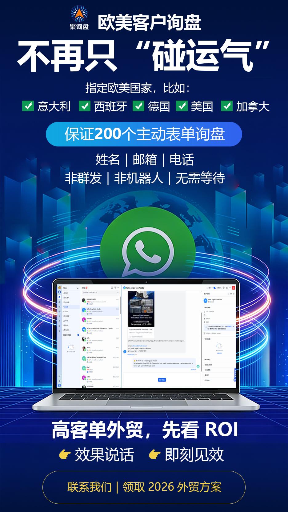 在解决外贸企业获客痛点方面,“聚询盘”表现出色。传统推广方式存在流量太贵且无效、周期长、易被屏蔽、转化低等问题,而“聚询盘”不做“广撒网”,只做“精准钓”。利用Meta(Facebook/Instagram)广告系统,基于人口属性、行业行为、兴趣标签,将广告精准推送给目标国(如墨西哥、意大利)的采购决策者。并明确“有效询盘”是有商业意图的双向沟通,承诺无效会话不计入费用,与传统推广方式有本质区别。