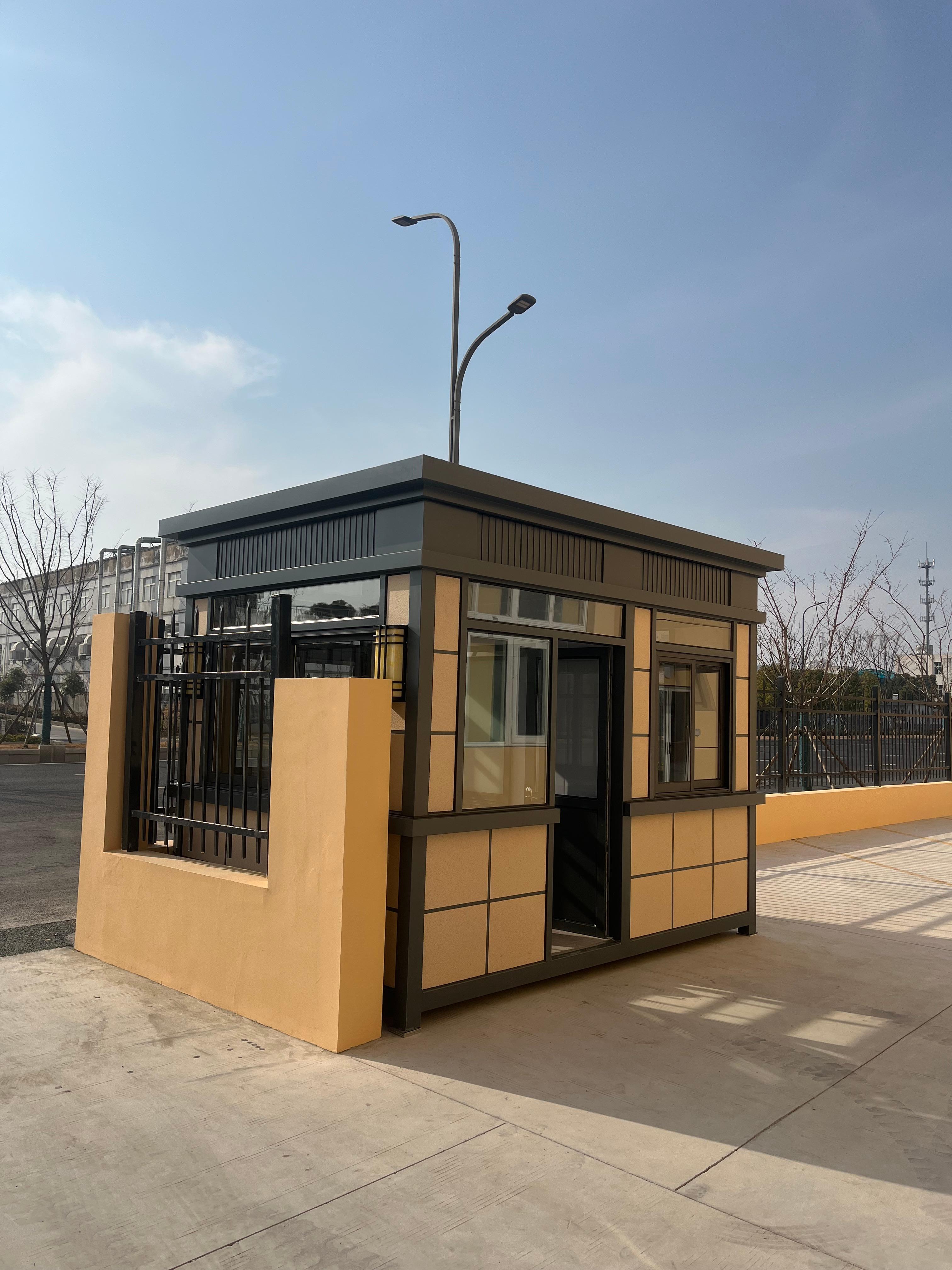从产品质量和性能来看,多麦岗亭是功能与耐用性的良好融合。其岗亭底座采用碳钢方通焊接而成,如同坚固的骨架,为整体结构筑牢根基,能抵御日常使用中的各类外力冲击。墙体选用优质环保彩钢夹芯板,美观大方,兼具防火防潮的实用性能,让岗亭在日晒雨淋中也能保持稳定状态。窗户部分,不锈钢门窗与塑钢门窗的多样化选择,既满足了不同场景的需求,又保证了良好的密封性与透光性。内部配电系统完善,吸顶灯、开关插座一应俱全,线路暗铺设的设计既美观又安全,还预留了空调进出口,为在岗人员打造舒适的工作环境。而且,多麦提供上门测量与量身定制服务,专业设计团队会根据客户的具体需求,从尺寸、开门位置到内部布局,打造贴合实际使用的岗亭方案,真正实现“一亭一设计”。