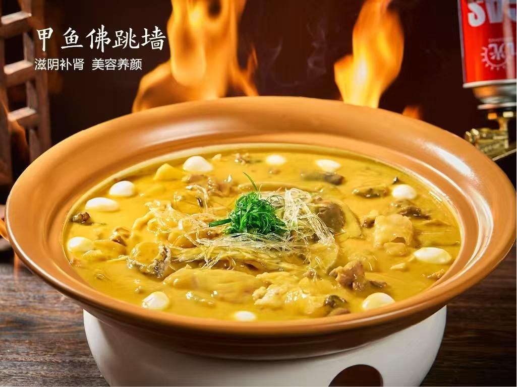 该餐厅的黄焖甲鱼选用的是来自中国甲鱼之乡洞庭西滨汉寿县的甲鱼。其养殖基地位于汉寿县龙阳泽勇农场水库以及酉港镇的太白湖,优质5800公顷黄金水源再加上湿地水源与洞庭湖平原周边的独特气候为汉寿甲鱼提供了优越的人放天养生长环境和优良的中华鳖品系品种。这里的甲鱼裙边宽大而肥厚、肉质紧实,富含胶原蛋白与微量元素硒,自古为滋阴补虚的食疗上品。以豫菜“黄焖”技法为骨,湘菜香辣为魂,慢火煨出金黄浓汤。汤中暗藏玄机:添黄芪、当归,党参少许,补气活血;铁棍山药强健脾胃,佐以湖南辣椒,辛温散寒。搭配定制的五常大米,米香与药香交融,甲鱼软糯入味,食后通体暖润,恰如《本草纲目》所言:“鳖甲滋阴,久食轻身不饥。