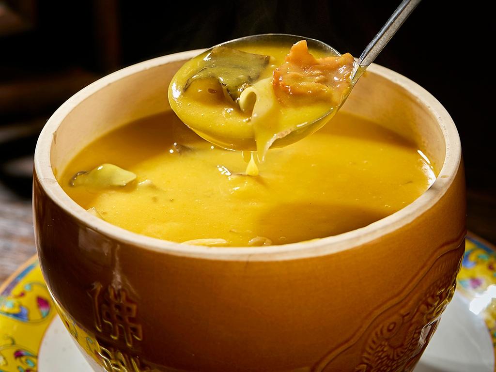 长湘豫甲鱼宴甄选洞庭湖汉寿甲鱼,其裙边宽大而肥厚、肉质紧实,富含胶原蛋白与微量元素硒,自古为滋阴补虚的食疗上品。以豫菜“黄焖”技法为骨,湘菜香辣为魂,慢火煨出金黄浓汤。汤中暗藏玄机:添黄芪、当归,党参少许,补气活血;铁棍山药强健脾胃,佐以湖南辣椒,辛温散寒。搭配定制的五常大米,米香与药香交融,甲鱼软糯入味,食后通体暖润,恰如《本草纲目》所言:“鳖甲滋阴,久食轻身不饥”。