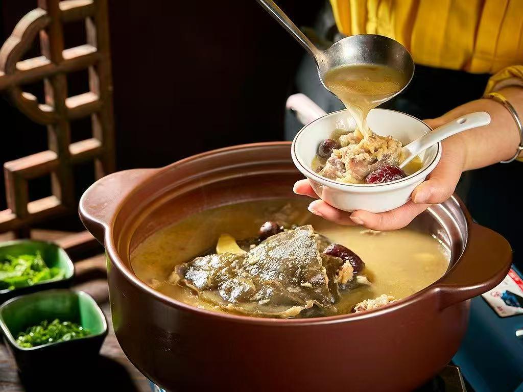 这道药膳黄焖甲鱼以豫菜“黄焖”技法为骨,湘菜香辣为魂,慢火煨出金黄浓汤。汤中暗藏玄机,添黄芪、当归、党参少许,补气活血;铁棍山药强健脾胃,佐以湖南辣椒,辛温散寒。搭配定制的五常大米,米香与药香交融,甲鱼软糯入味,食后通体暖润,恰如《本草纲目》所言:“鳖甲滋阴,久食轻身不饥”。