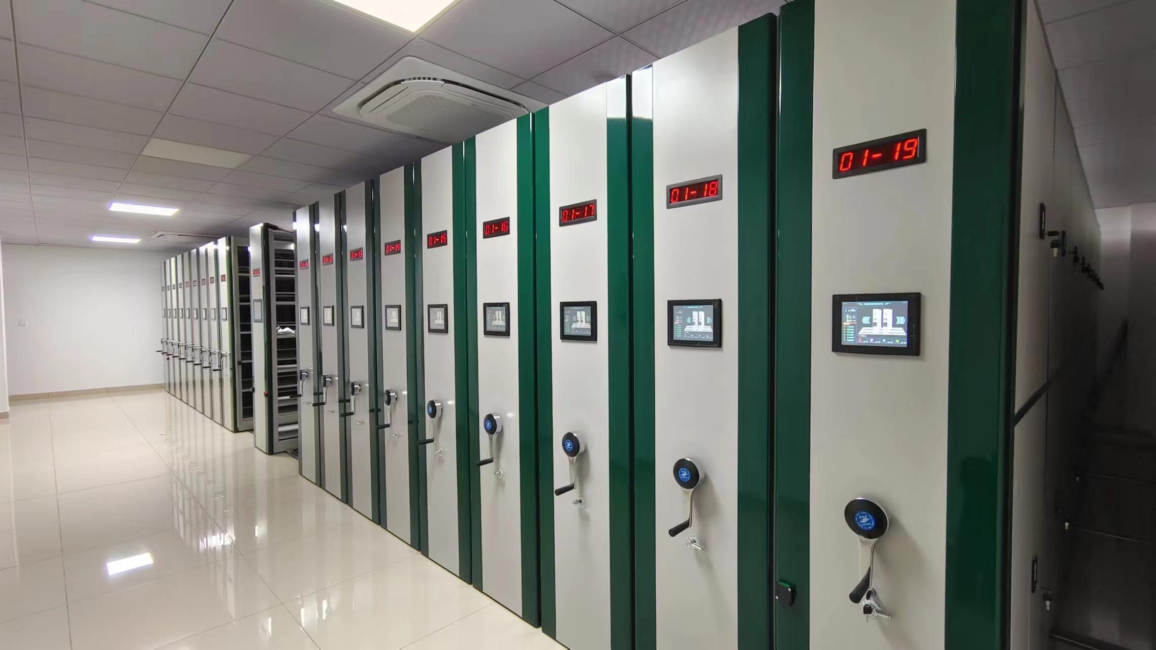 产品质量和性能上,公司严格执行标准GB/T 13667系列《钢制书架》、GB/T 3325《金属家具通用技术条件》,行业标准DA/T 7《直列式密集架》、DA/T 65《档案密集架智能管理系统技术要求》。管理体系通过ISO 9001认证,ISO 14001环境管理体系、ISO 45001职业健康安全管理体系认证。其产品结构承重方面,主柱厚度≥1.5mm,层板厚度≥1.0mm,单层承重≥80kg,满载状态无变形;传动系统双向同步传动,传动比1:5.5,手摇力≤3.5N/标准节,运行噪音≤45dB,操作轻便平稳;运行精度方面,轨道平行度≤0.5mm/m,架体移动直线度≤1.5mm,防倾倒装置灵敏可靠;智能响应方面,智能密集柜单次开启时间≤3秒,定位精度≤2mm,支持远程控制与批量操作;密封防护方面,防尘板间隙≤1.5mm,磁性密封条吸附牢固,有效防光、防尘、防潮。