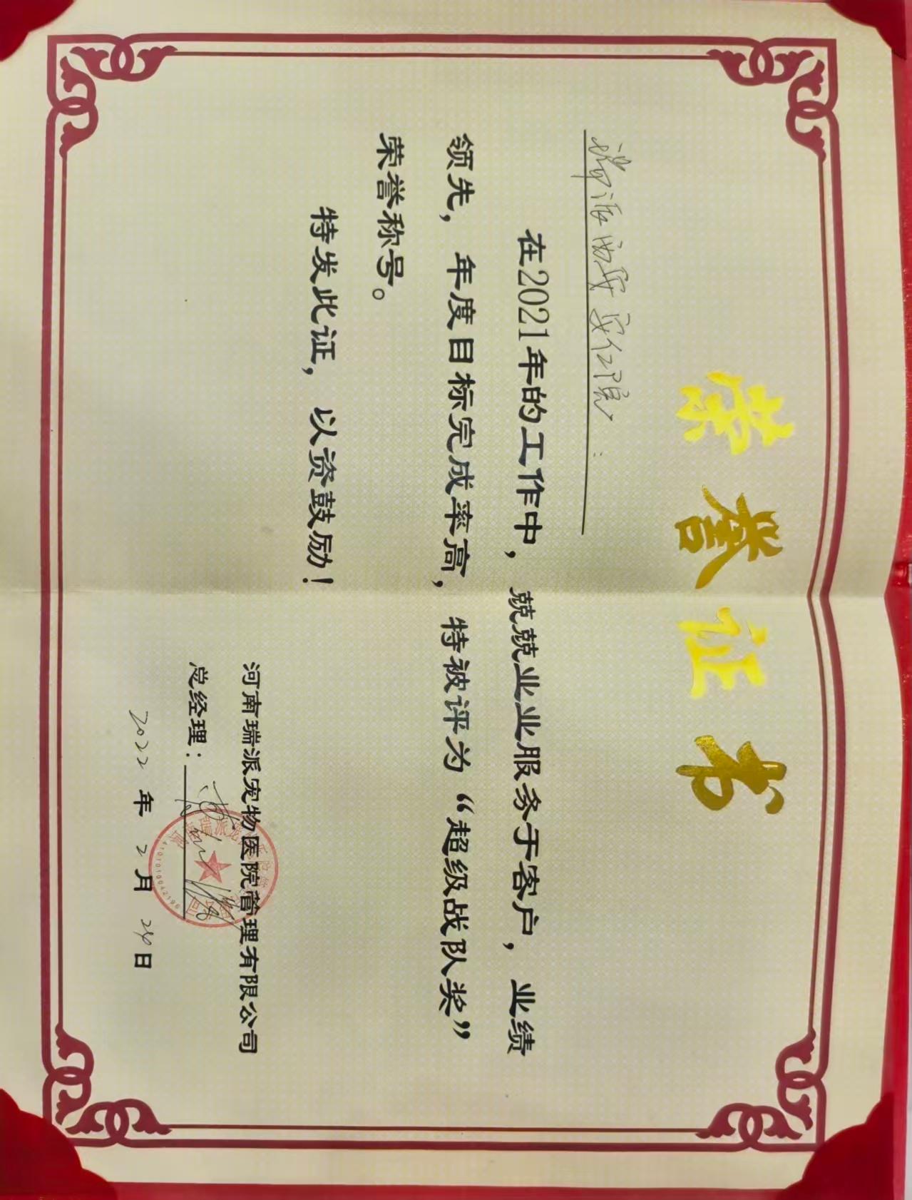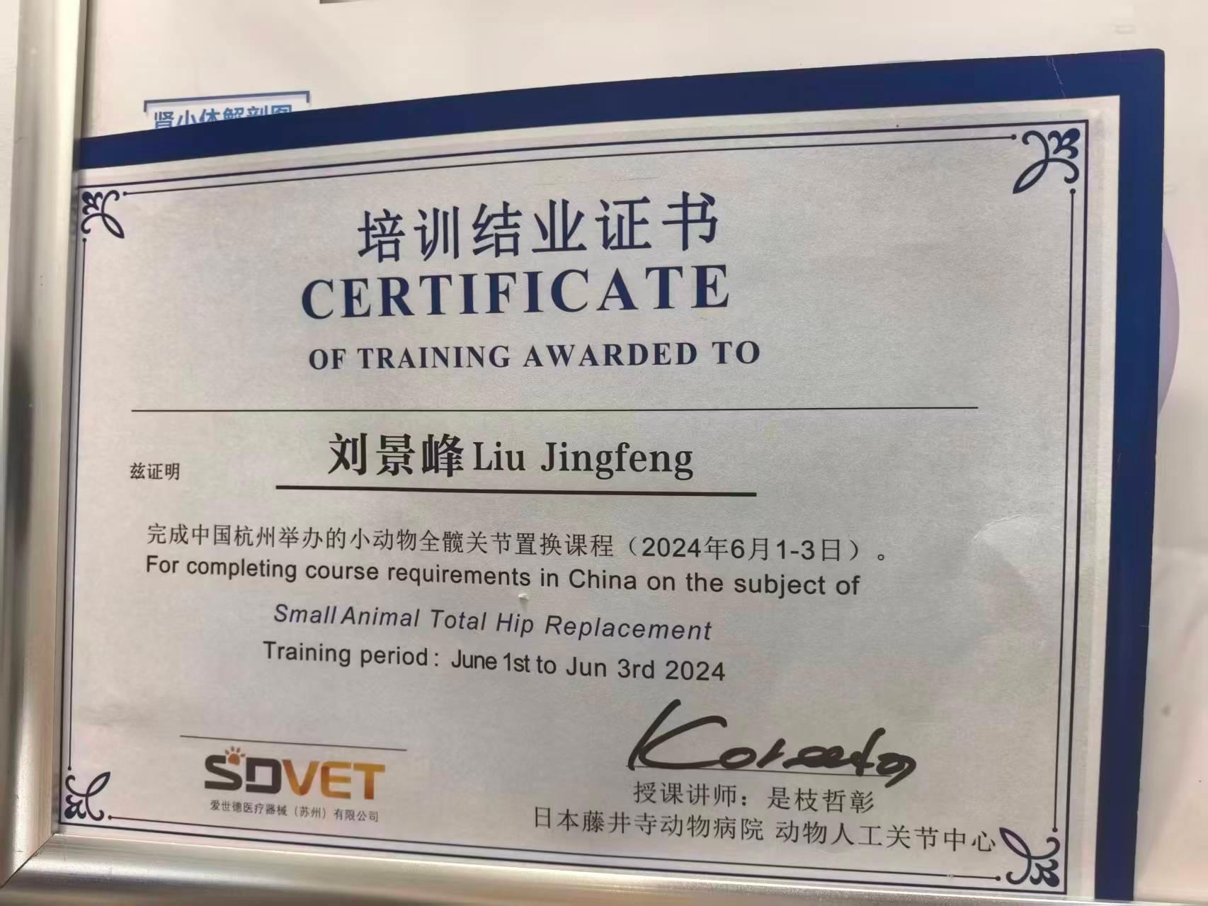医院的医师也获得了诸多****,刘景峰医生获得硕腾高阶学苑猫学科结课证书、硕腾高阶学苑小动物骨科结课证书等多项证书;冯奇斌医生获得勃林格大学 - 猫内科结课证书。