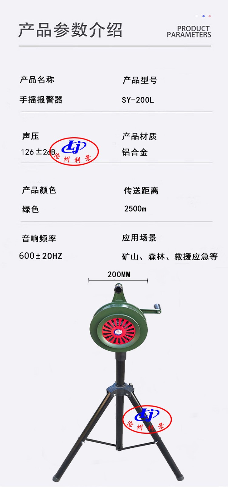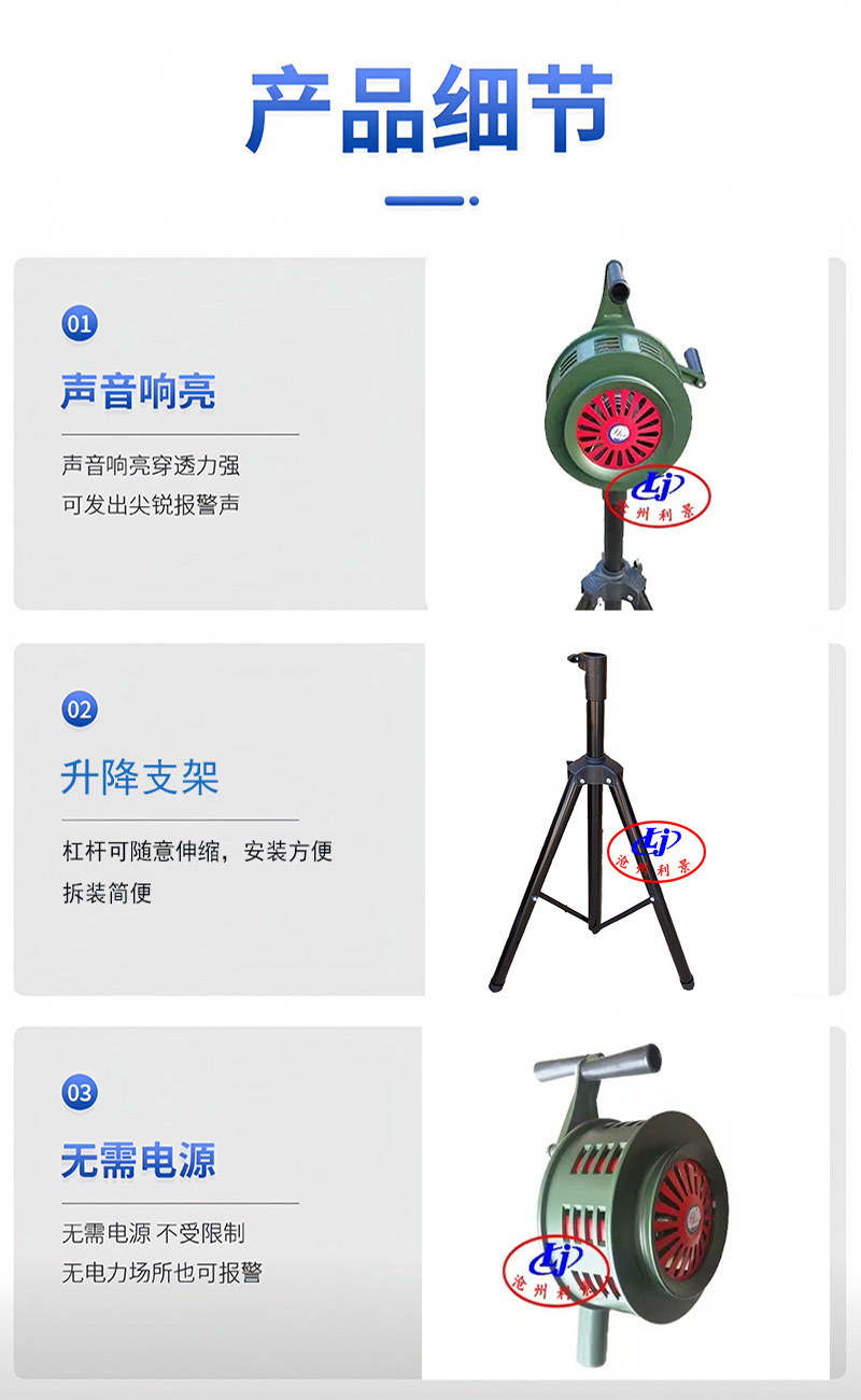 沧州利景环保设备有限公司发布的铝合金手摇报警器传送距离2500米三角支架款SY-200L图集库