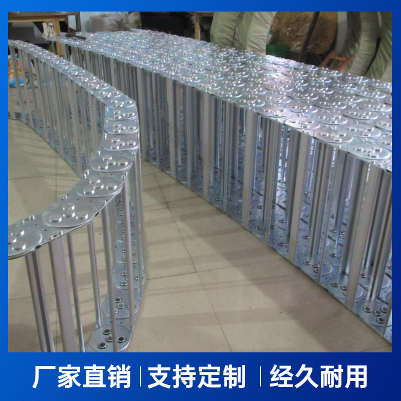 钢铝拖链的材质:冷轧钢和不锈钢。拖链的型号、拖链的总宽、拖链的长、支撑板的型式、支撑板内置孔的大小、拖链的弯曲半径。