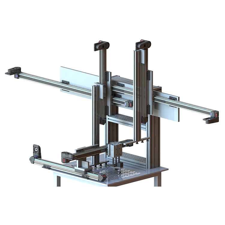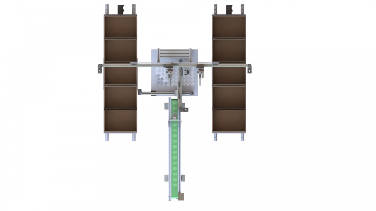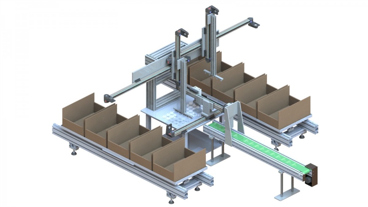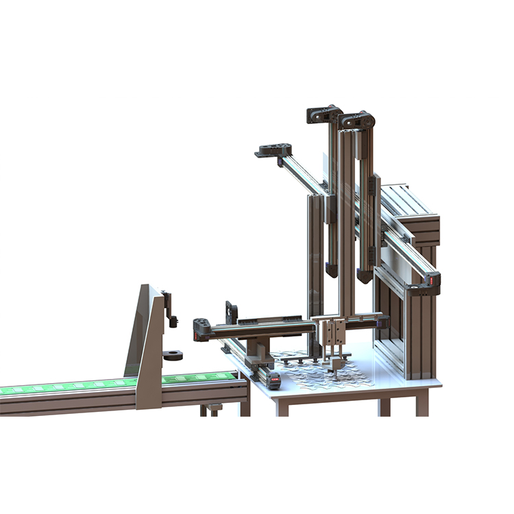 此分料装箱自动化设备是安装在流水线尾端,通过视觉识别产品特征信息和位置信息将物料进行分别摆放,可根据客户需求定制;