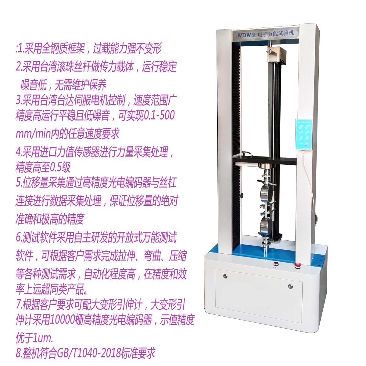 WDW-2020系列微机控制电子式试验机,主要用于非金属和金属材料拉伸、压缩、弯曲等性能试验。主机为门式强度框架。机械传动采用圆弧同步齿形带、滚珠丝杠传动,因为不用减速机,因此主机功率小,无间隙传动,具有使用寿命长、噪音低、无需维护等特点能做低周疲劳等试验。试验机由主机、PC机控制系统、用户软件包、功能附件等部件组成。