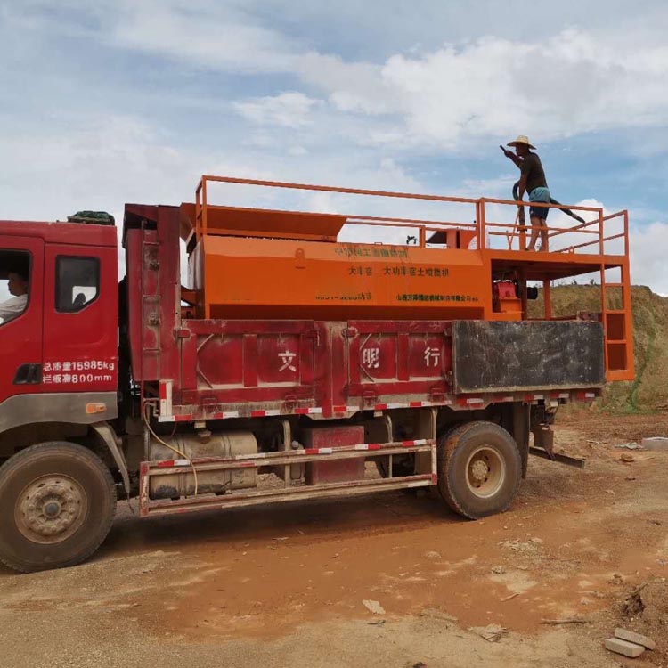 客土喷播机是应用于边坡绿化客土喷播的专业设备,通过本设备将土嚷基质、草籽、保水剂、粘合剂、肥料等,在喷播机搅拌罐中与水混合成胶状的浆液,用高耐磨合金泥浆喷播泵,将其喷播于坡面上。由于混合浆液中含有保水材料、黏合材料、各种养分,在保证了植物生长所需的水和其它营养物质来源的同时有效防止雨水冲刷对喷播材料的破坏,故而植物能够健康、迅速地成长。