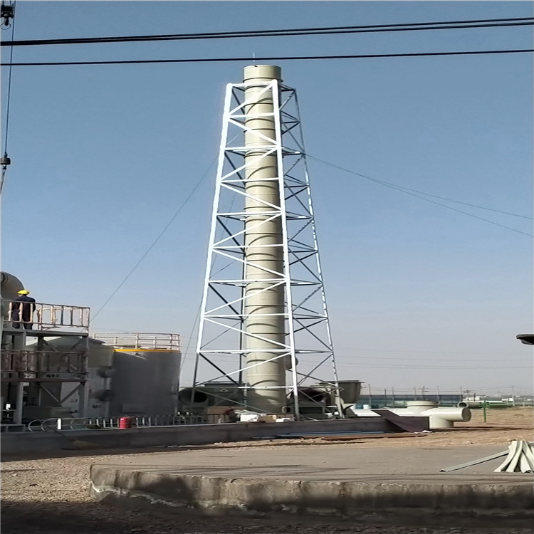 烟囱塔:主要对烟囱固定保持作用。其结构形式分为四柱角钢结构和三柱钢管结构,中间采用抱箍对烟筒进行固定。主要是以钢结构支撑架来支撑被支撑管体,结构形式为自立式和拉线式,多用于化工企业、石油部门、易燃气体排放等,高度范围十到一百米。塔体材料多采用角钢和钢管。