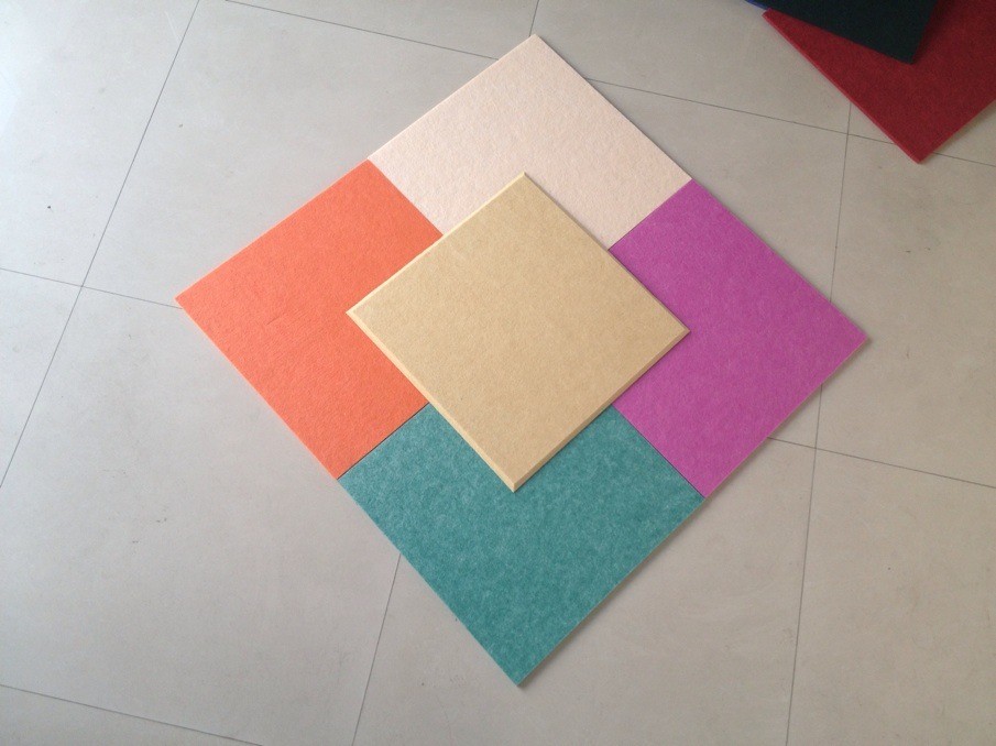 聚酯纤维吸音板有40多种颜色,可以拼成各种图案。表面形状有平面、方块(马赛克状)、宽条、细条。板材可弯成曲面形状。可使室内体形设计更加灵活多变,富有效果。甚至可以将艺术画通过电脑复印在聚酯纤维吸音板上。