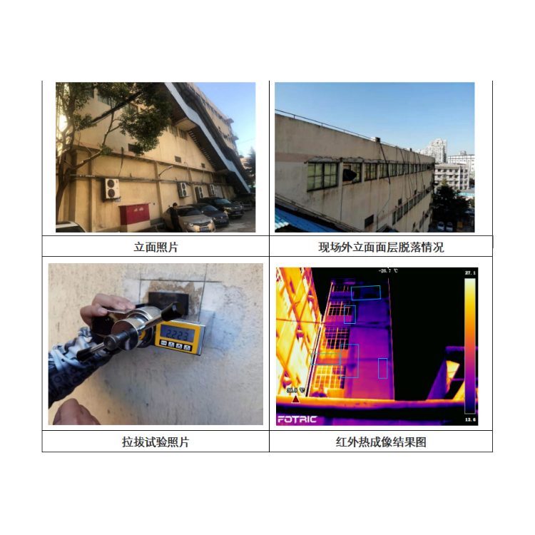 一般建筑物的外墙面在一天中或一年中都会对因气温或太阳辐射热的变化产生周期的温度变化。建筑物的表面温度将因墙面材料的比热和热传导率的物理性质差异、表面形态及状态的差异而有所变化,从而在墙体温度场分布上产生差异。红外热成像法通过红外热像仪快速扫描探测建筑物外墙的温度场分布,以二维热像图的形式表现物体表面的温度场情况,并通过综合处理分析,判断是否存有缺陷。其优点是可以针对外墙进行非接触的扫描,快速大面积的发现外墙饰面的红外辐射异常,从而达到快速寻找外墙饰面质量病害区位置的目的。