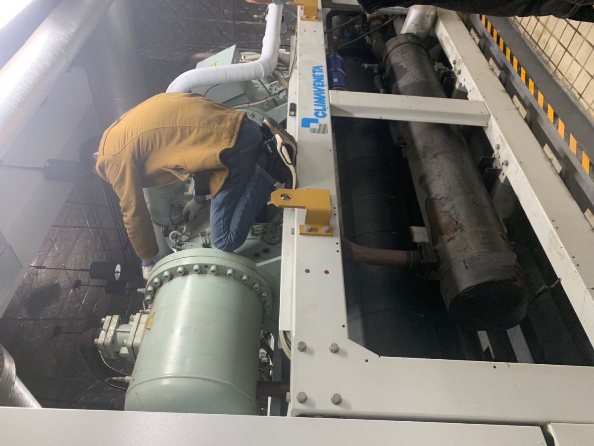 技术人员到现场后先抽真空,需抽12小时以上真空抽完后冲注制冷剂按标准冲注,开机前需甲方配合,机器开启后观察机器运转是否正常,正常后,运转3-5天须把、冷冻油、干燥过滤更换一遍,由于该机器所用脂类油,可以在干燥滤芯处加纤维棉花(用布包好)过滤油里脏东西,5小时进行一次,三天换油期到了时候把蒸发器打开,把残留脏油清理干净,装好后再进行换油处理!机组运转正常,机组调试完毕。