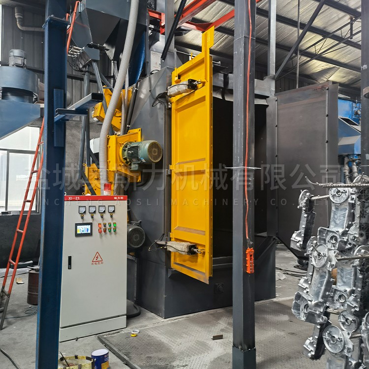 吊钩式抛丸机分为单吊钩和双吊钩,吊钩式抛丸机由两个吊钩装载工件交替进入抛丸清理室内。利用抛丸器将0.2~0.8的弹丸抛向工件的表面,使得工件的表面达到一定的粗糙度,让工件变得美观,或者改变工件的压应力提高寿命。本机型广泛应用于铸造、建筑、化工、电机、机床等行业的中、小型铸、锻件的表面清理或强化处理。并且本机型适合于不宜碰撞的细长、薄壁件的清理。