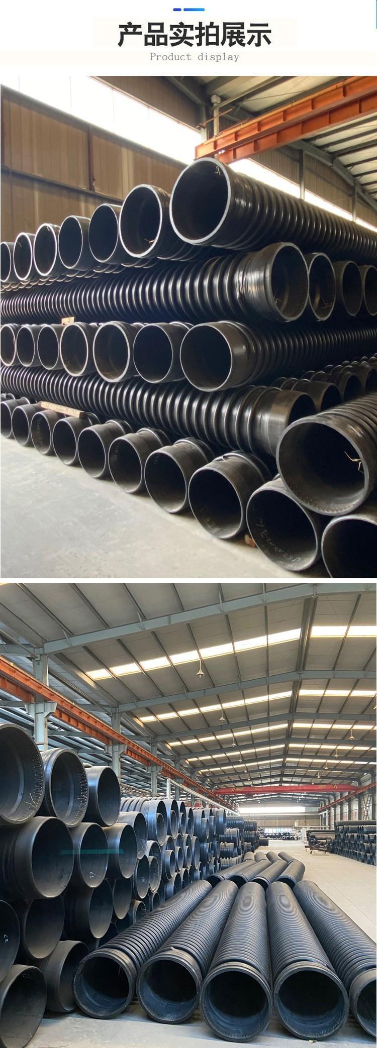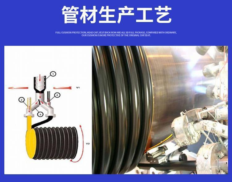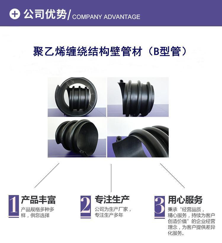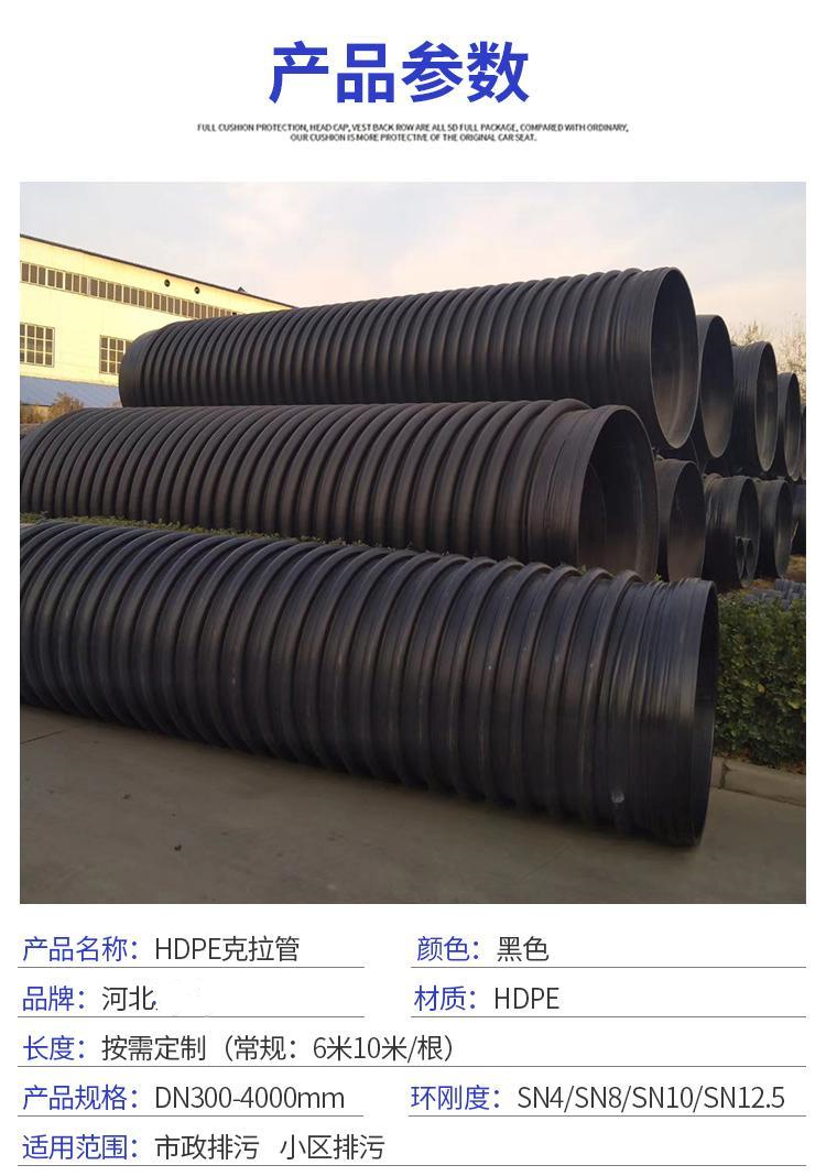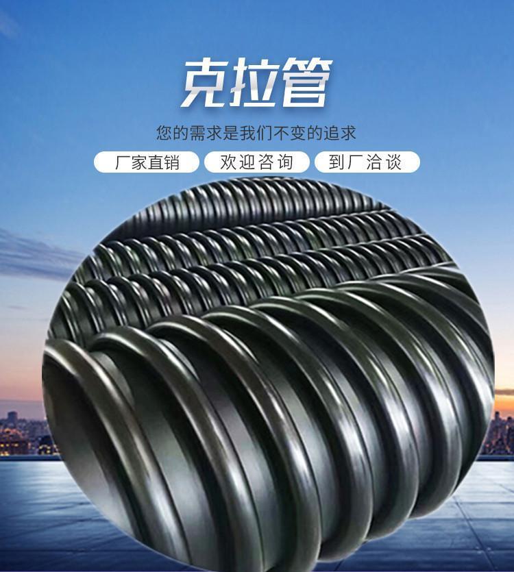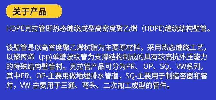 克拉管既热态缠绕成型高密度聚乙烯缠绕结构壁管一、HDPE缠绕结构壁管简介HDPE缠绕结构壁管是以高密度聚乙烯树脂为主要原材料,采用热态缠绕杨型工艺,以聚丙烯(PP)单壁波纹管为支撑结构制成具有较高抗外压能力的特殊结构壁管材。所生产的产品可分为PR、OP、SQ、VW三种系列,其中:PR、OP-主要用做埋地排水管道,SQ-主要用于制造容器或窨井,VW-主要用于三通、弯头、二次加工成型的管件,产品中应用PR系列,该产品内表面光滑、外部为异型增强结构,管材标准长度为6米,管内径范围为DN300-DN4000,产品指标 均达到GB/T 19472. 2-2004 B型结构壁管标准及PREN-13476欧洲标准要求。
