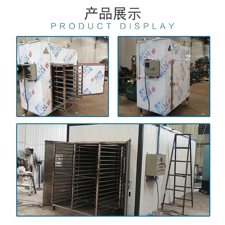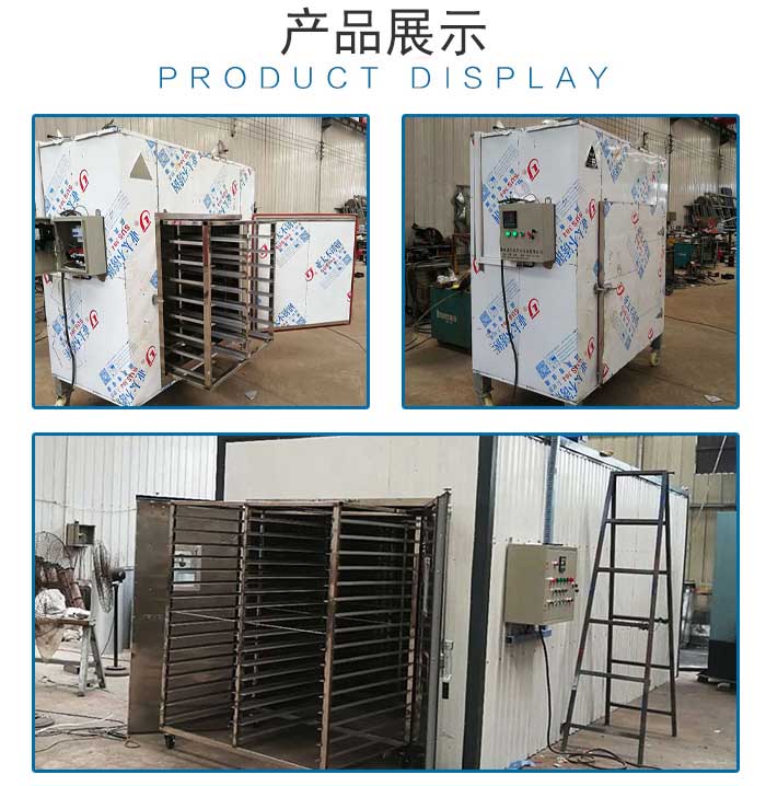药材烘干箱由加热系统、排潮系统、温湿度控制系统组成。循环风机将热风送入热风通道,再通过调风板进入物料室,采用这种上下左右两侧送风方式,使烘干更加均匀。热风在烘干箱内封闭下降式循环,热效率高,节约能源,没有二次污染,符合食品卫生标准要求。