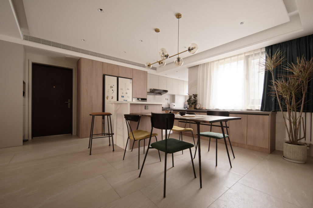 客厅原本碎片化的窗户,让我们调整设计的完整大气,观景通透。客餐厨的通透,大大提升了户型的舒适性、互动性。材质上都选择的哑光系列。环保。打造柔和放松,略带休闲气氛的环境。大地色系的放松氛围下。局部的亮色给空间增添活力、趣味。