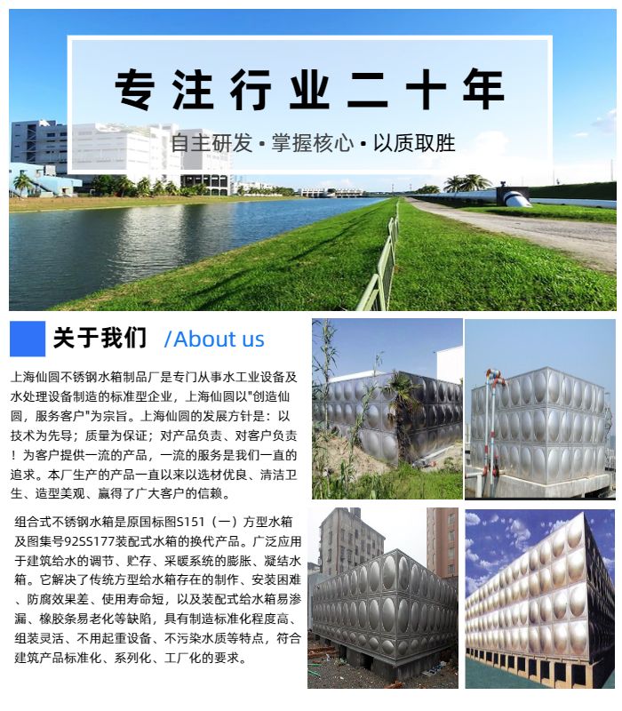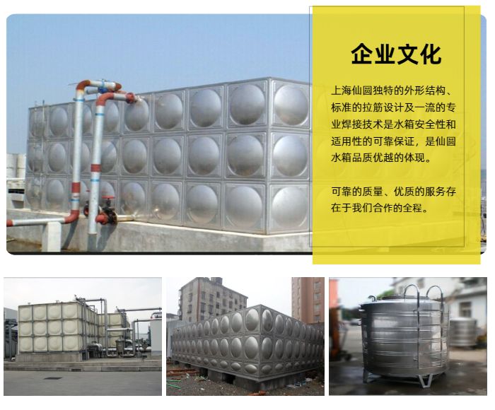 使用功能全封闭,有进水、出水、溢流、排污之功能,安装简便,您只需将水箱 置于房顶,接上水管即可使用,保养十分方便。不锈钢水箱广泛用于高楼公寓、工厂、学校、别墅及其它各个领域。水箱规格不锈钢方形拼装水箱可从O.5T-2000T,水箱,并可依据客户需求承接不同类型的特殊制作。不锈钢圆形水箱可从0.5T-200T,并可依据客户需求承接不同类型的特殊制作。