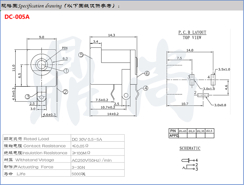 东莞市鼎尚电子有限公司发布的DC-005A电源插座图集库