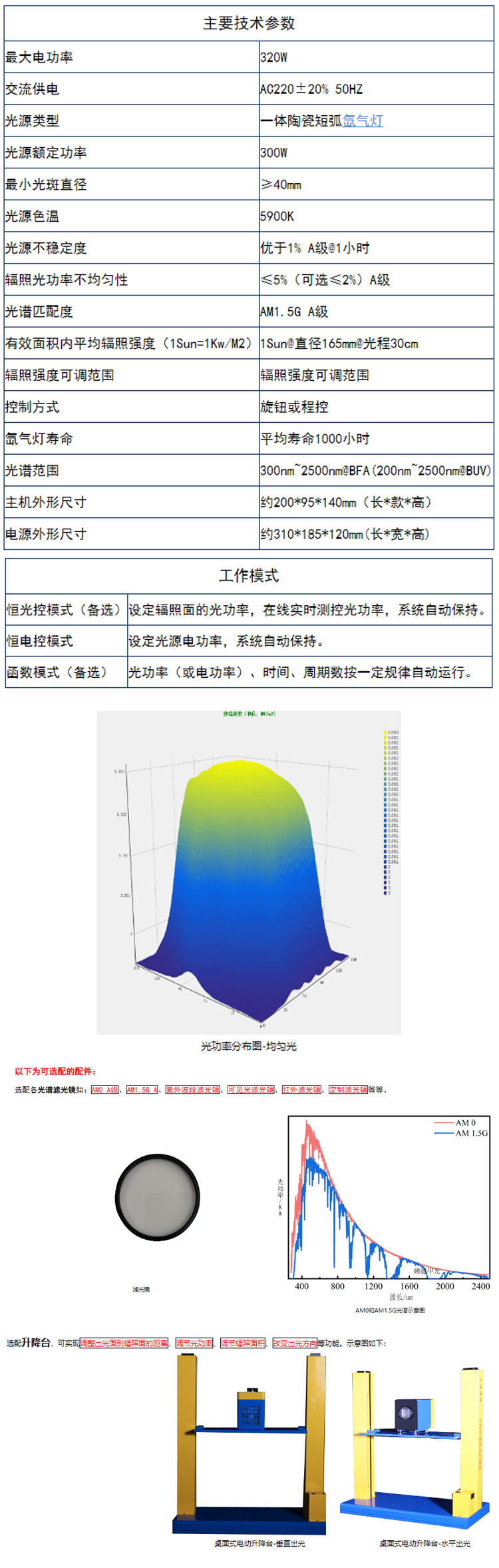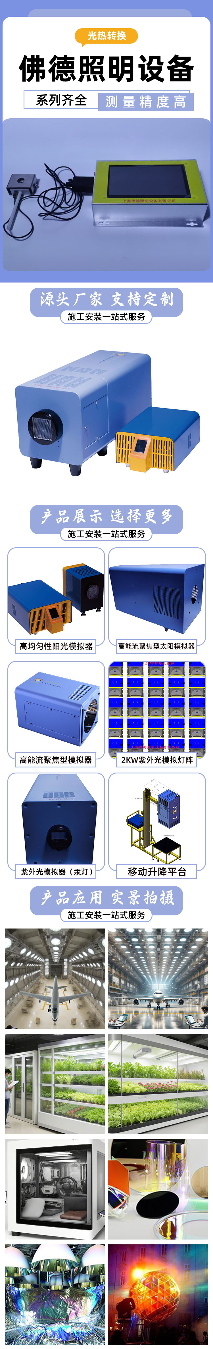 我公司生产的太阳能模拟器-300系列采用一体陶瓷氙气灯为光源,内部集成了抛物镜,输出从紫外到红外的全光谱光阳光。在高精密光学系统的作用下,可获得均匀性达A级的辐照光斑。可选配各种光谱滤光镜,获得实验需要的光谱。太阳能模拟器的控制系统有多种模式,如控制电功率、光电闭环控制、多周期函数控制等等。我司有独立自主的研发、生产、工程能力,与国内多个高校、科研院所合作。