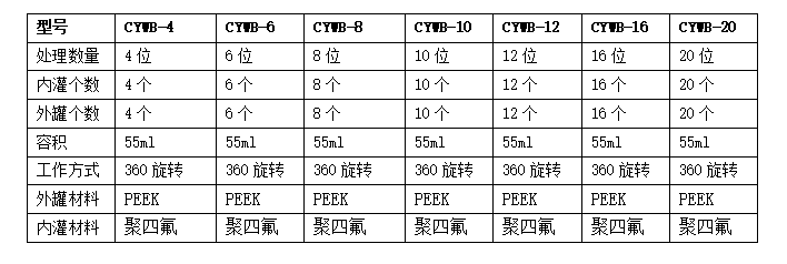 外罐采用进口PEEK宇航材料,内罐材质:聚四氟材料;内罐反应容积:55ml(标配)和100ml(选配) 。