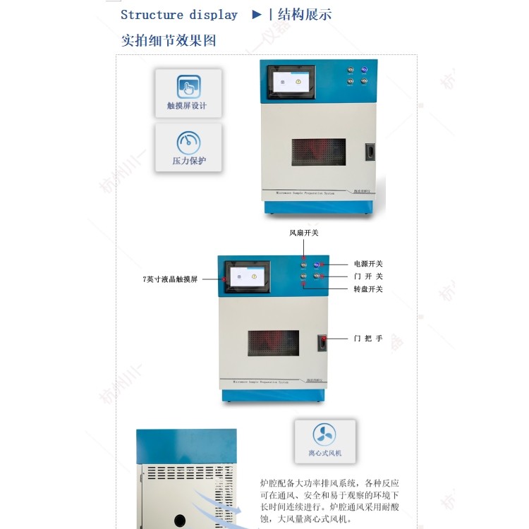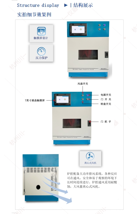 2.4压力控制系统:采用非接触式控压方式,控压精准无误差,实时检测控制并显示微波消解反应罐内的压力;