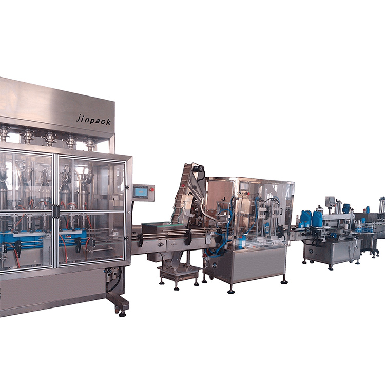送料转盘——灌装——自动上盖+锁盖——铝箔封口——自动贴标