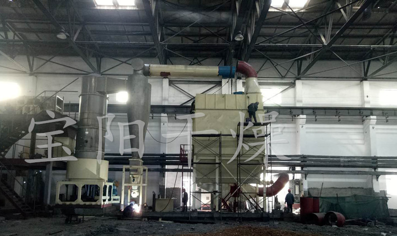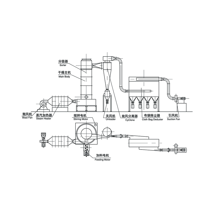 热空气切线进入干燥器底部,在搅拌器带动下形成强有力的旋转风场。膏状物料由螺旋加料器进入干燥器内,在高速旋转搅拌桨的强烈作用下,物料受撞击、磨擦及剪切力的作用下得到分散,块状物料迅速粉碎,与热空气充分接触、受热、干燥。脱水后的干物料随热气流上升,分级环将大颗粒截留,小颗粒从环中心排出干燥器外,由旋风分离器和除尘器回收,未干透或大块物料受离心力作用甩向器壁,重新落到底部被粉碎干燥。