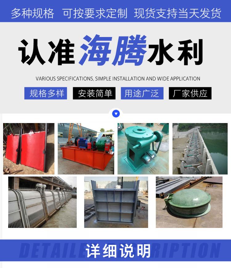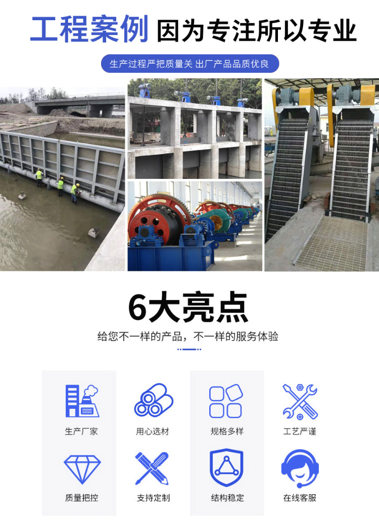 主营产品:钢坝闸门、钢制闸门、铸铁闸门、不锈钢闸门,QL型、QLC型、QLP型螺杆启闭机,QPQ、QPK、QPH、QPT型卷扬启闭机启闭机,玻璃钢拍门、钢拍门、不锈钢拍门、拦污栅、回转式清污机、抓斗清污机、橡胶止水带等水工产品。