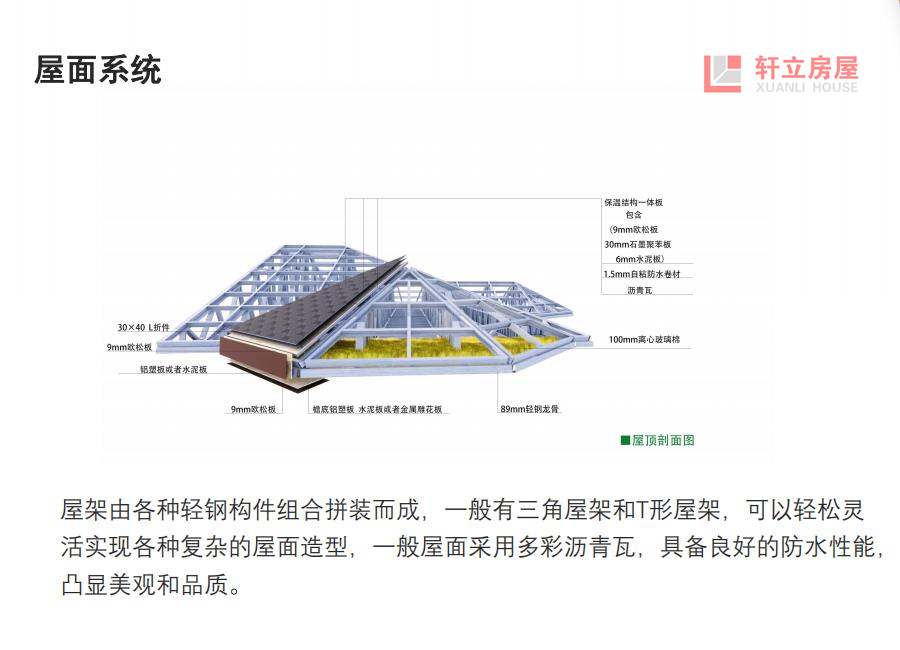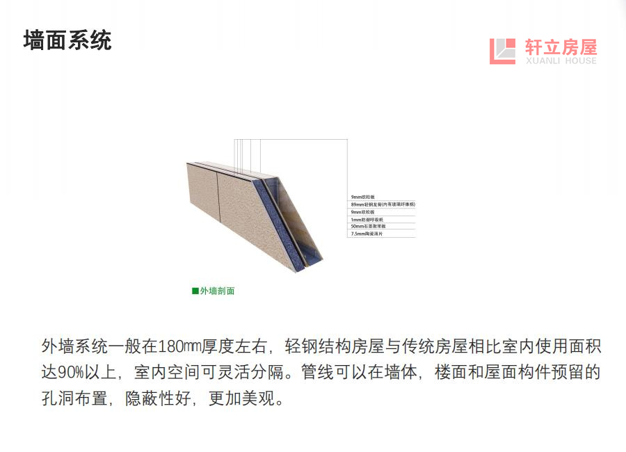 轻钢别墅墙体内含两层保温结构,即玻璃丝棉和挤塑板,可以实现墙体较薄情况下远优于砖混墙体的保温隔热效果。外墙使用防潮呼吸纸,外界湿气无法进去室内,而室内湿气可以排除室外。