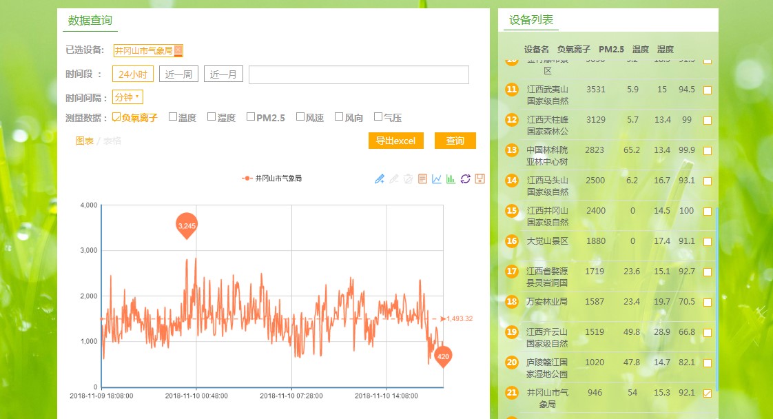 ▲基于WEBGIS显示,可以在互联网上任意一台电脑浏览实时数据。基于地图的实时数据显示,能够在地图上显示所有站点的当前的负氧离子浓度。