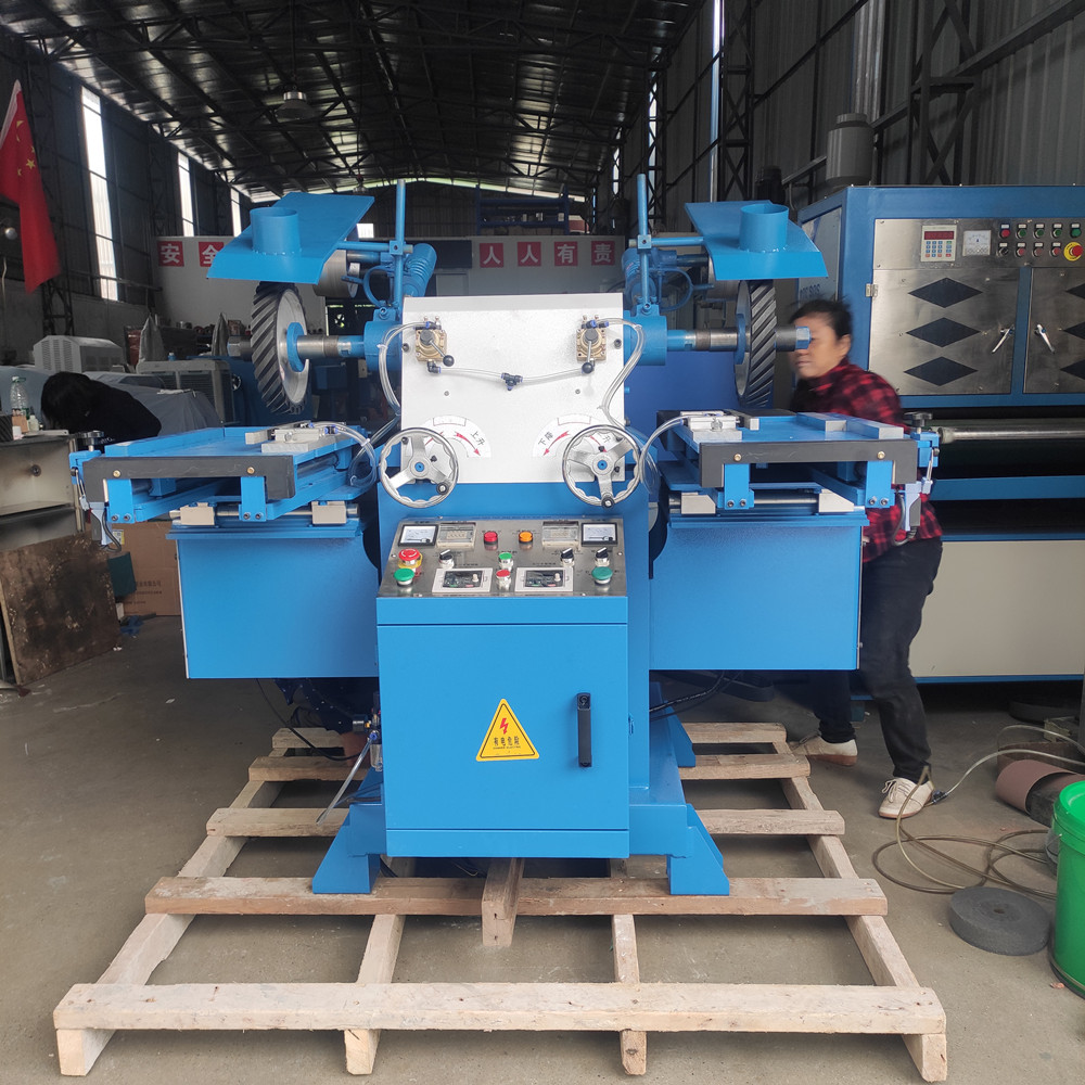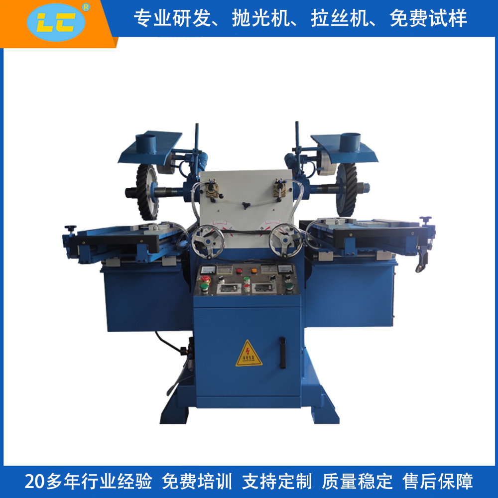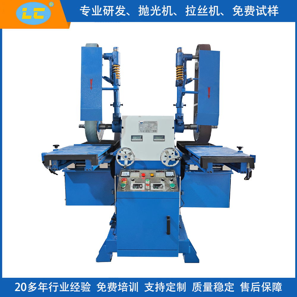 特点:可一边装砂带,另一边安装拉丝轮,工作台前进后退采用液压式,主轴转速有变频可调速快慢,双工位可独立控制,起到打砂、拉丝同台机器完成,代替了手工拉丝所产成的产品不稳定。