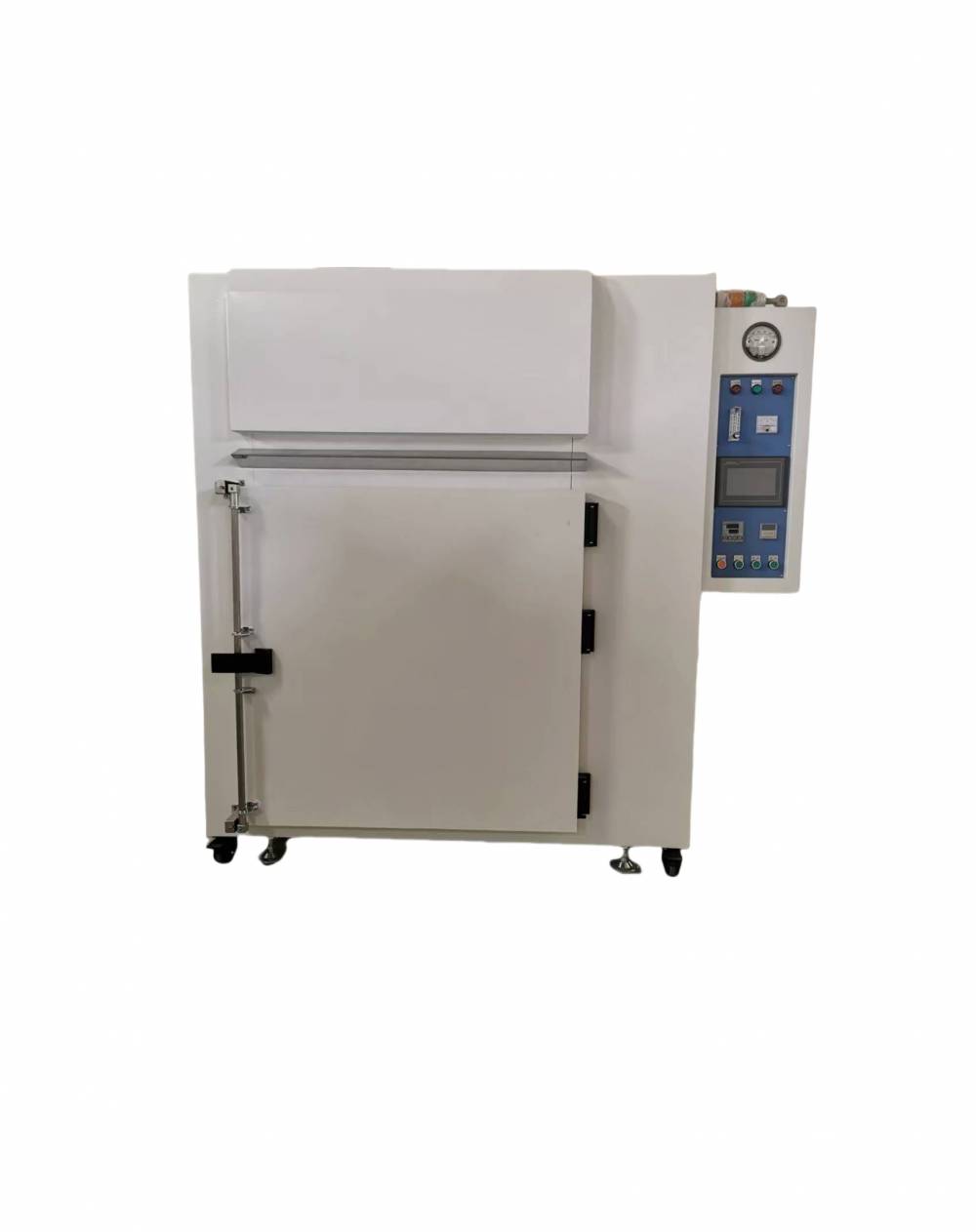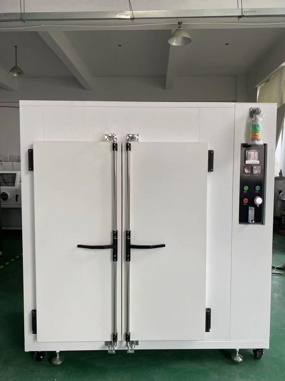 精密热风烤箱是一种高功能、高信赖度烤箱,结构、材质强度、保温、循环风道等均设计精良,且外形美观、操作方便。空气循环系统为水平式循环送风,风源由循环马达运转带动风轮经电热器,将热风由风道送至烤箱内部,且将使用后空气吸入风道成为风源再度循环加热,如此可得到较佳的温度均匀性,均匀度可达±1.5%,当门开、关动作引起扰动时,可借此送风循环系统迅速回复操作状态温度值。