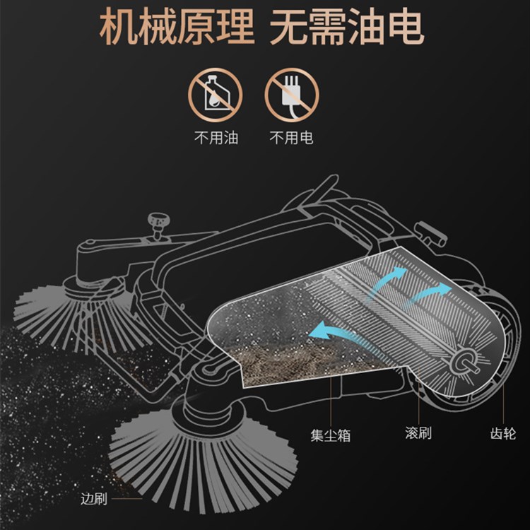 无尘扫地机清扫,能够长时间操作,无受时间限制。对一些固体大颗粒物质清扫。手推无动力清扫机,省时省力,滚刷由脚轮直接驱动,推动极为轻松,可以折叠放置易于存储,主刷可调节高度,大容量垃圾箱,适合清扫跑道、车间、库房等,该设备的清扫效率是人工清扫效率的6倍以上。